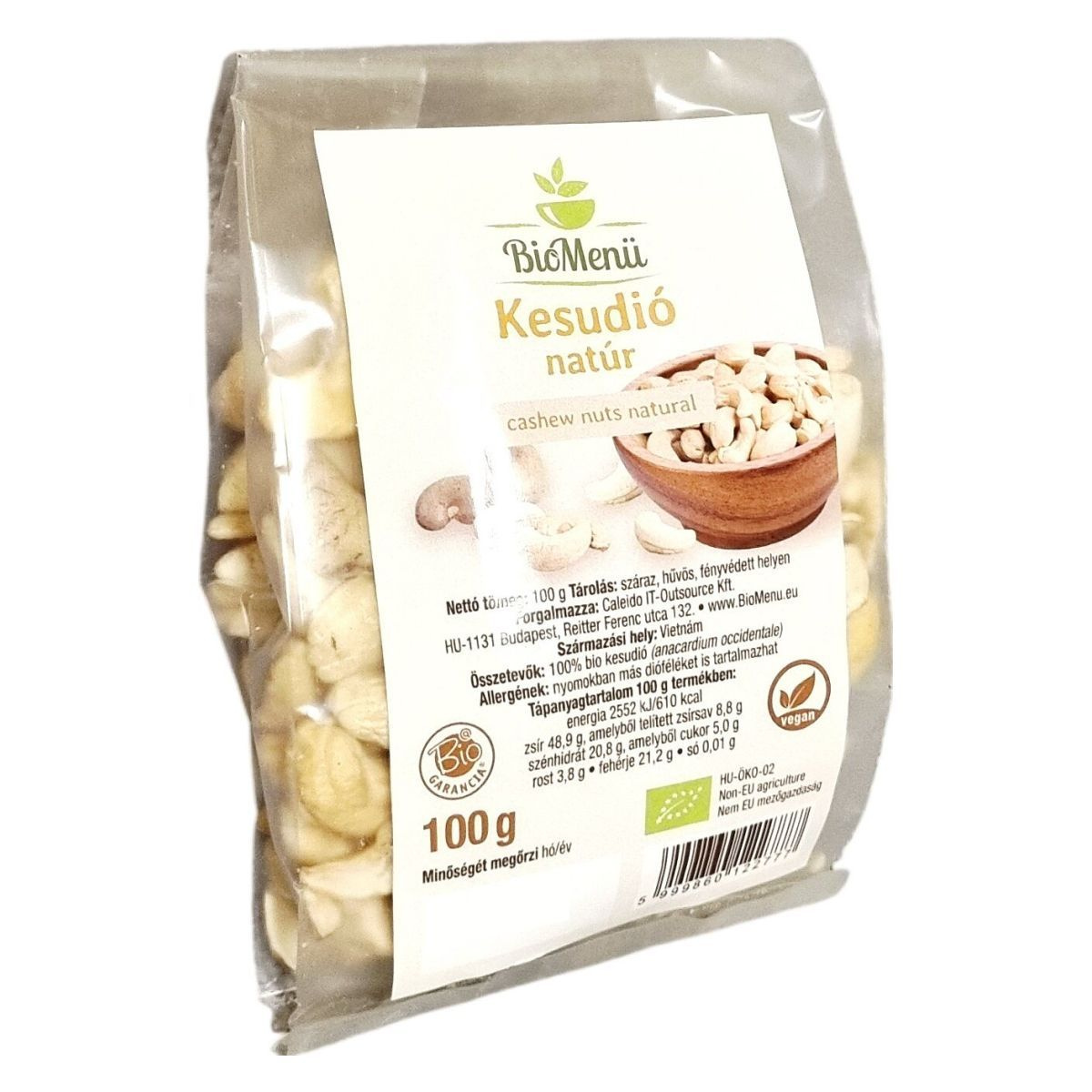 A BioMenü natúr kesudió 100 g-os kiszerelésben, Vietnám területéről származik, melynek termesztése nem EU mezőgazdasági területen történik. A termék bio minősítésű, így garantáltan környezetbarát és természetes alapanyagokból készült, ideális mindennapi fogyasztásra vagy különféle ételek ízesítésére. Kiváló energiaforrás természetes zsírokkal és fehérjével, miközben minimális sótartalommal rendelkezik. A termék csomagolása gondoskodik a frissesség megőrzéséről, a minőségét megőrzi, de a pontos lejárati dátumot a csomagoláson kell ellenőrizni.