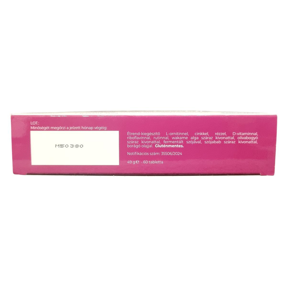 mikrokristályos cellulóz, kalcium-foszfát, L-ornitin-hidroklorid, fermentált szójabab, szójabab mag száraz kivonata, hidroxi-propil-metil-cellulóz, D-vitamin élesztő, maltodextrinek, olívabogyó száraz kivonat, térhálós nátrium-karboximetil-cellulóz, nátrium-karboxi-metil-cellulóz, cink-biszglicinát, kukoricakeményítő, wakame alga tallusz száraz kivonat, kukorica dextrinek, mannit, zsírsavak mono- és digliceridjei, magnézium-sztearát, sztearinsav, szilícium-dioxid, riboflavin, borágó olaj, tápióka-dextrinek, réz-biszglicinát, rutin, kárminsav