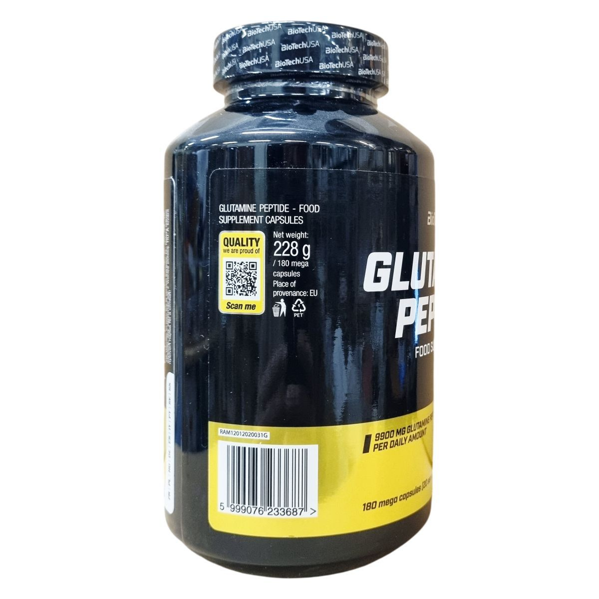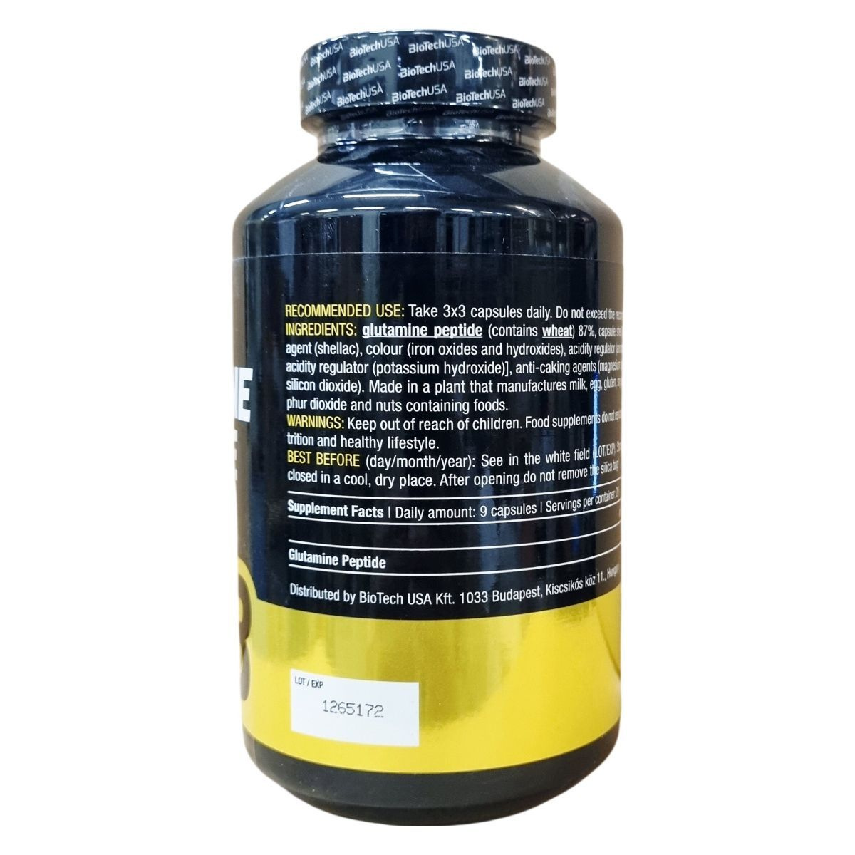 A BioTechUSA Glutamine Peptide készítmény egy kiváló minőségű étrend-kiegészítő, amely glutamin peptidet tartalmaz. Ez a készítmény nagy dózisban biztosítja a glutamint, amely az izmok egyik fontos alkotóeleme lehet. A kapszulák elkészítéséhez zselatint, valamint bevonóanyagokat és színezékeket használtak fel, továbbá csomósodást gátló anyagok is jelen vannak benne a megfelelő minőségért és állagért. A termék 180 mega kapszulát tartalmaz, amely összesen 20 adagot jelent, így egy csomag hosszabb ideig is elegendő lehet. Az ajánlott napi mennyiség 9 kapszula, amely 9900 mg glutamin peptidet biztosít. Figyelni kell arra, hogy ne lépjük túl az ajánlott adagot, továbbá szem előtt kell tartani, hogy ez az étrend-kiegészítő nem helyettesítheti a teljes értékű, kiegyensúlyozott étrendet és az egészséges életmódot. A termék tárolását hűvös, száraz helyen, légmentesen lezárva javasolt végezni, a szilika zselé tasakot pedig a kapszulák mellett hagyni kell a felbontás után, hogy megőrizze a készítmény minőségét. A készítményt olyan üzem állítja elő, amely más allergéneket is feldolgozhat, így erre érzékenyek számára különösen fontos az óvatosság.