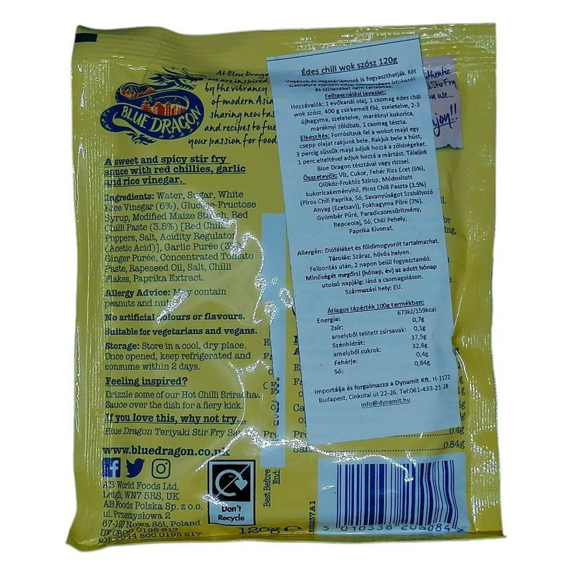 2 személyre ajánlott adag. Mesterséges ízfokozót és színezéket nem tartalmaz. Felhasználási javaslat: Hozzávalók: 1 evőkanál olaj, 1 csomag édes chili wok szósz, 400 g csirkemell filé, szeletelve, 2-3 újhagyma, szeletelve, maréknyi kukorica, maréknyi zöldbab, 1 csomag tészta. Elkészítés: Forrósítsuk fel a wokot majd egy csepp olajat rakjunk bele. Rakjuk bele a húst, 3 percig süssük majd adjuk hozzá a zöldségeket. 1 perc elteltével adjuk hozzá a mártást. Tálaljuk Blue Dragon tésztával vagy rizzsel. Összetevők: Víz, Cukor, Fehér Rizs Ecet (6%), Glükóz-Fruktóz Szirup, Módosított Kukoricakeményítő, Piros Chili Paszta (3.5%) (Piros Chili Paprika, Só, Savanyúságot Szabályozó Anyag (Ecetsav)), Fokhagyma Püré (3%), Gyömbér Püré, Paradicsomsűrítmény, Repceolaj, Só, Chili Pehely, Paprika Kivonat. Allergén: Dióféléket és földimogyorót tartalmazhat. Tárolás: Száraz, hűvös helyen. Felbontás után, 2 napon belül fogyasztandó.