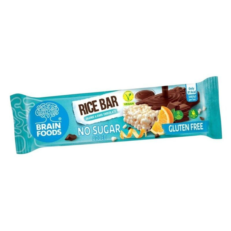 Puffasztott teljeskiőrlésű barna rizsből készült narancsos szelet étcsokoládéval bevonva.