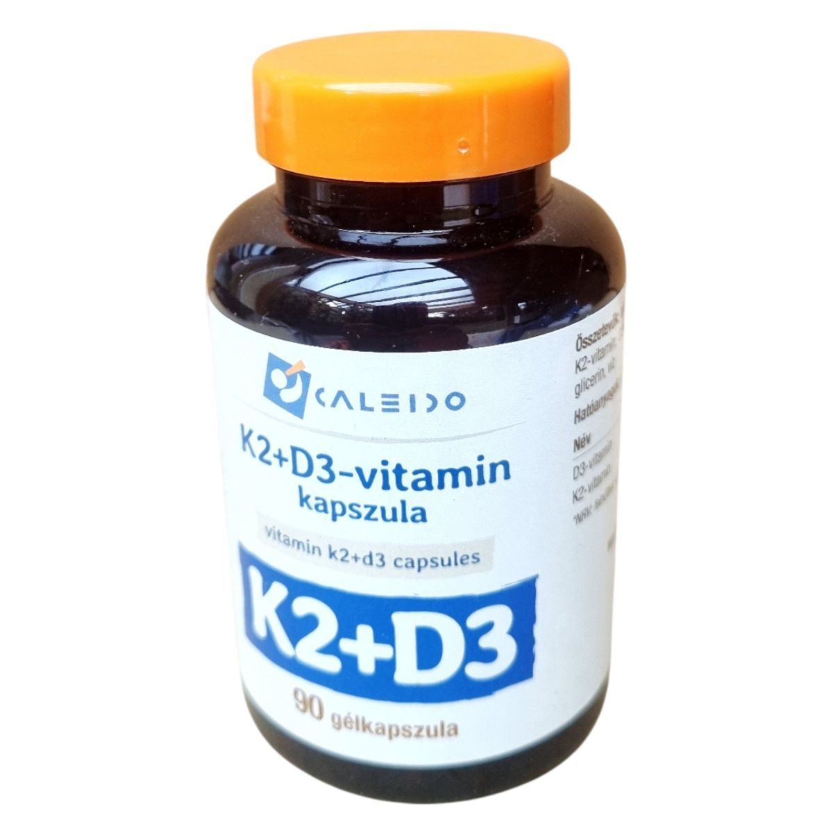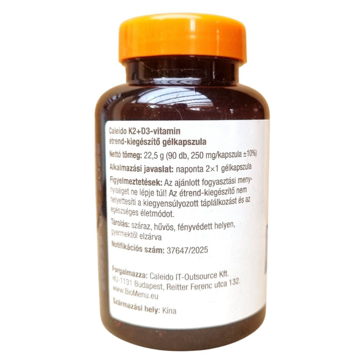 A Caleido K2+D3-vitamin kapszula egy étrend-kiegészítő, amely 90 gélkapszulát tartalmaz. A termék K2- és D3-vitamint biztosít, amelyek fontos szerepet játszhatnak a csontok egészségének fenntartásában. A D3-vitamin különösen magas, 2800%-os NRV értéke kiemelkedő. Az összetevők között megtalálható a napraforgómag-olaj, marhazselatin, glicerin és víz. A terméket száraz, hűvös, fényvédett helyen kell tárolni, gyermektől elzárva. A forgalmazó a Caleido IT-Outsource Kft., és a termék Kínából származik.