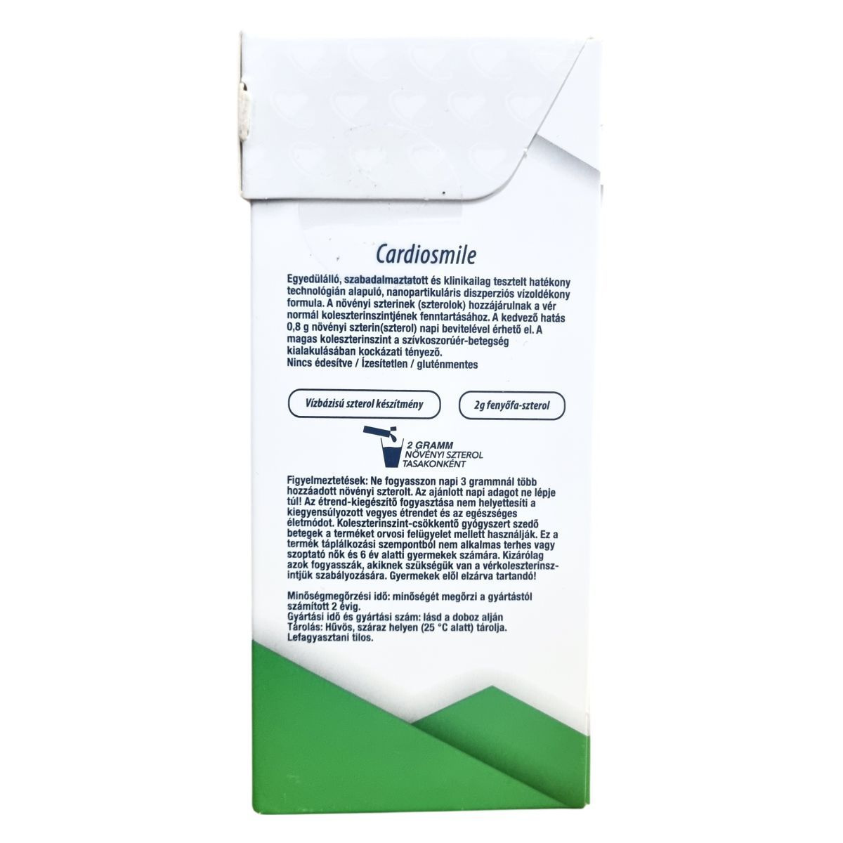 A Cardiosmile egy szabadalmaztatott, klinikailag tesztelt, nanopartikuláris diszperziós technológián alapuló vízoldékony formula, amely vízbázisú növényi szterol készítményt tartalmaz. A termék 2 gramm növényi szterolt biztosít tasakonként, amely hozzájárulhat a normál vérkoleszterinszint fenntartásához. A magas koleszterinszint rizikófaktora lehet a szívkoszorúér-betegség kialakulásának, ezért a termék fogyasztása támogathatja a koleszterinszint szabályozását. A termék édesítés és ízesítés nélkül készült, így bármilyen hideg vagy meleg italhoz vagy ételhez adható. Használat előtt a tasak felrázandó, majd közvetlenül elfogyasztható vagy az ételbe keverhető. A termék kizárólag azok számára ajánlott, akiknek szükségük van ilyen étrend-kiegészítőre, és nem pótolja a kiegyensúlyozott étrendet vagy az egészséges életmódot.