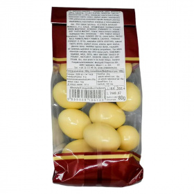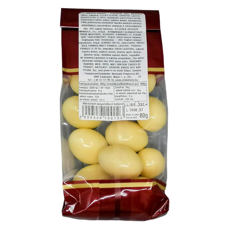 Mandula joghurtos fehércsokoládé bevonattal, tejporral és természetes aromákkal, édes nassolnivaló.