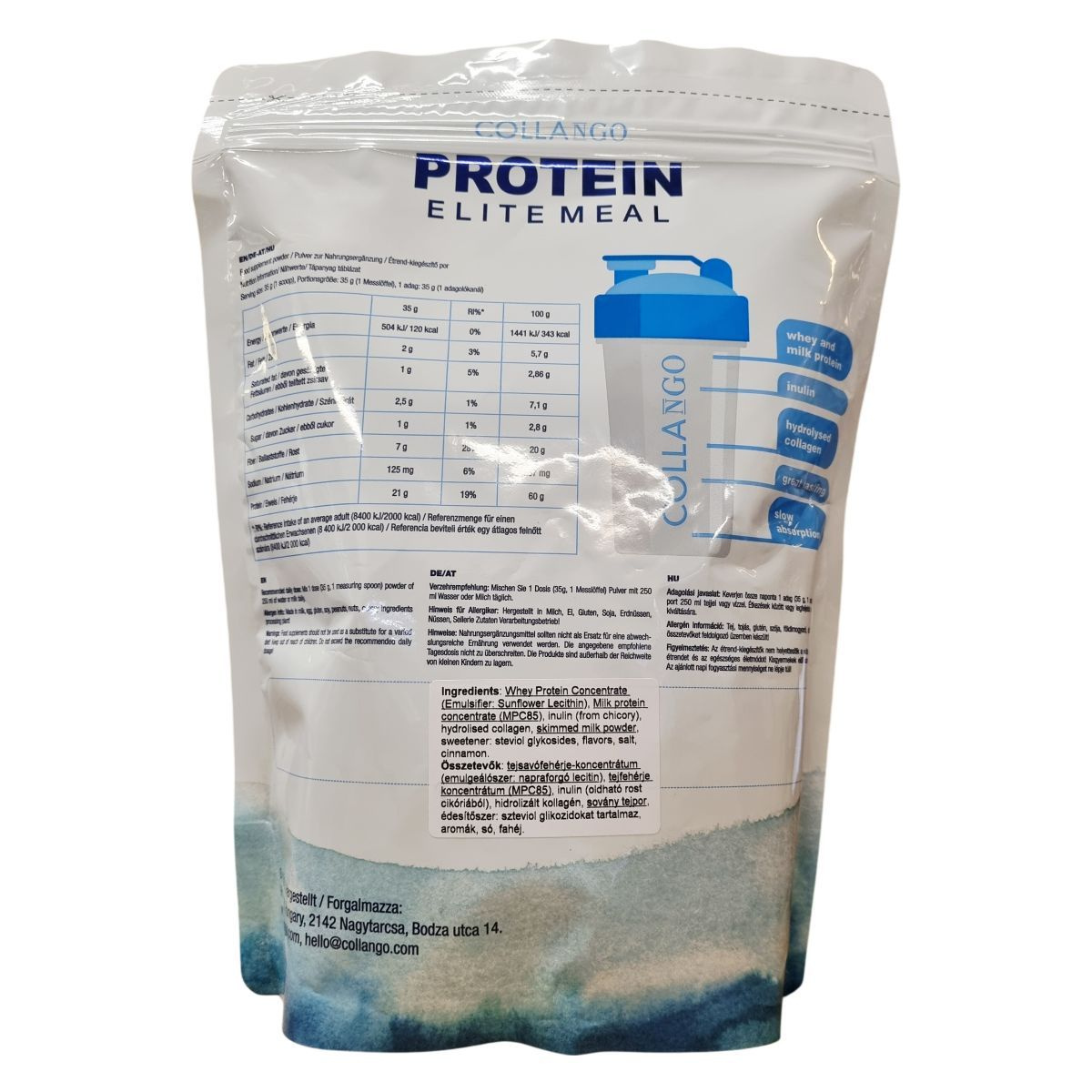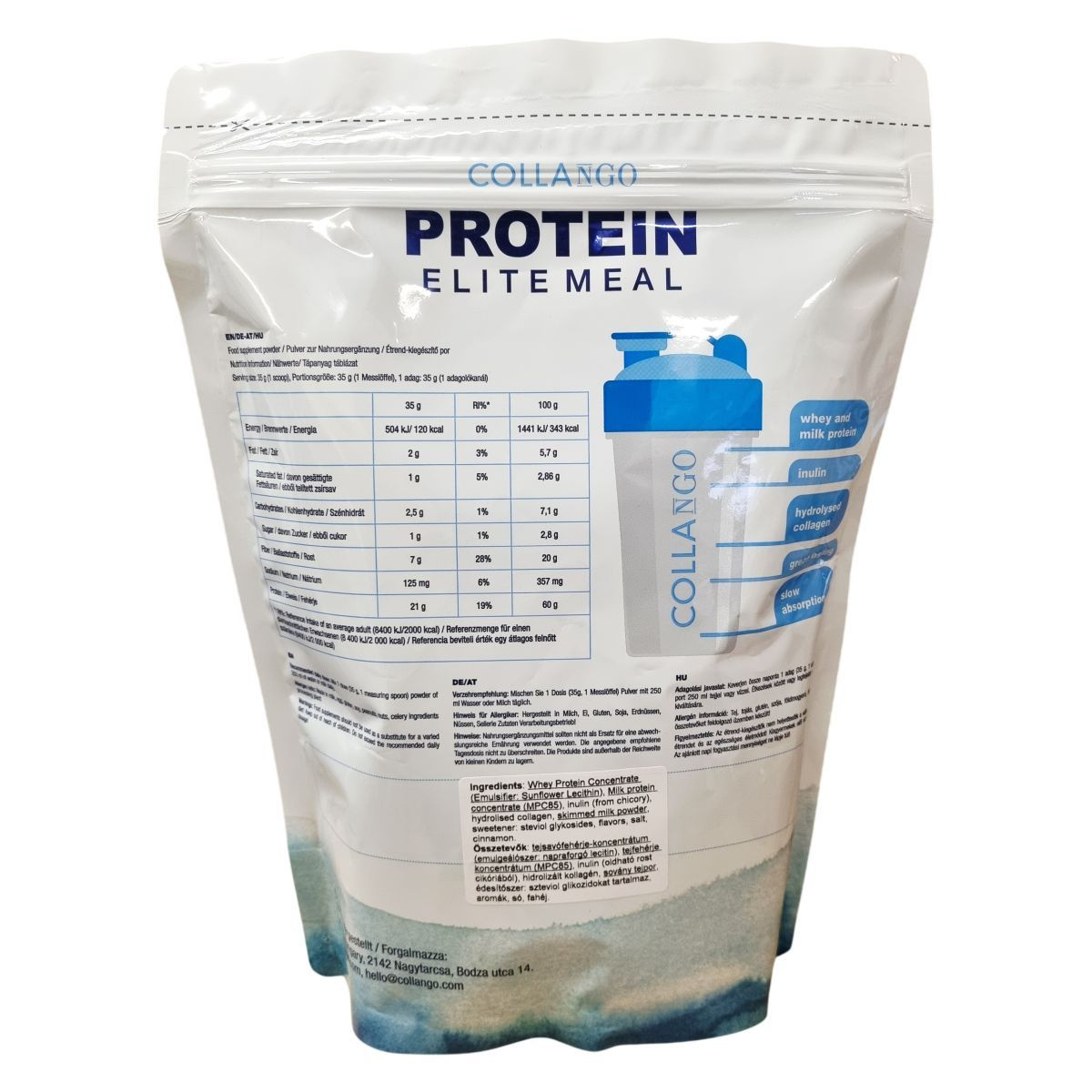 A Collango Protein Elite Meal egy könnyen oldódó, magas fehérjetartalmú és rostban gazdag étkezéshelyettesítő por, mely tej és növényi eredetű összetevőket tartalmaz, valamint hidrolizált kollagént. A termék ízesítése vanília-fahéj, természetes aromákkal kiegészítve. A készítmény mentes a gluténtől és az aszpartámtól, és nem tartalmaz hozzáadott cukrot. Étrend-kiegészítőként ajánlott bevenni, folyadékkal elkeverve, a vitamin- és ásványianyag bevitel kiegészítése mellett. Az összetevők közé tartozik a tejsavófehérje-koncentrátum emulgeálószerrel, tejfehérje-koncentrátum, cikóriából származó inulin, collagen, valamint sovány tejpor. Fogyasztása segítheti az egészséges életmódot, különösen aktív vagy változatos táplálkozást igénylő élethelyzetekben.