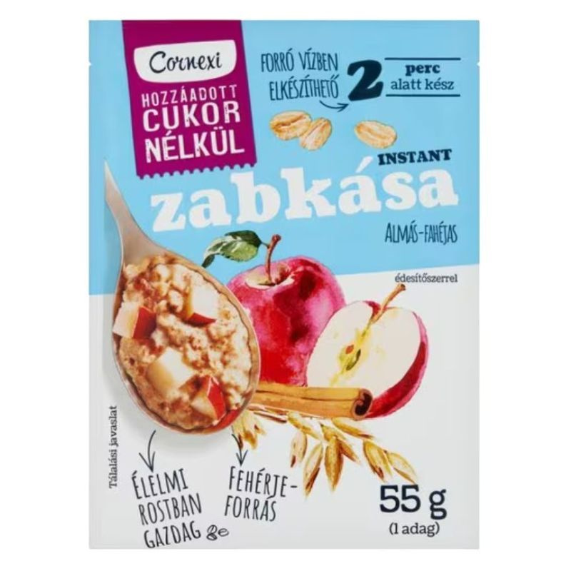 Összetevők: zabpehely 48 %, édesítőszer 17 % (maltit), sovány tejpor, kukoricakeményítő, szárított héjas almakocka 4,5 % [alma, antioxidáns (kén-dioxid)], mandula, fahéjőrlemény 0,8 %, étkezési só, étkezési sav (citromsav), aroma.