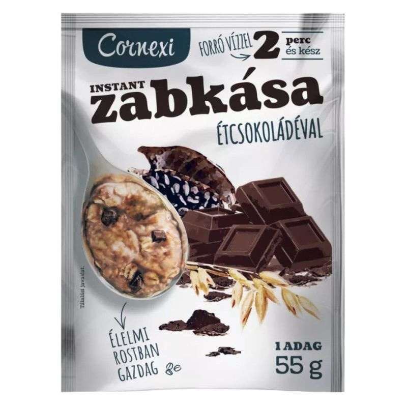 Étcsokoládés zabkása cukorral és édesítőszerrel. Forró vízzel 2 perc és kész, élelmi rostban gazdag.