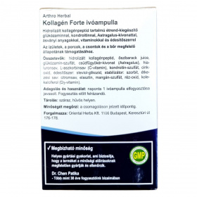 Az Arthro Herbal Kollagén Forte ivóampulla egy folyékony étrend-kiegészítő, amelyet az ízületek, a porcok, a csontok és a bőr megfelelő állapotának támogatására fejlesztettek ki. A termék nagy mennyiségű hidrolizált kollagénpeptidet, valamint hialuronsavat és elasztint tartalmaz. Az Astragalus-kivonat hozzájárulhat az ízületek mozgékonyságához és rugalmasságához, míg a C-vitamin támogathatja a normál kollagénképződést. A D-vitamin, a cink és a mangán hozzájárulhatnak az egészséges csontozat fenntartásához. A termék édesítőszerrel készül, és megbízható minőséget képvisel, amelyet a helyes gyártási gyakorlat biztosít.