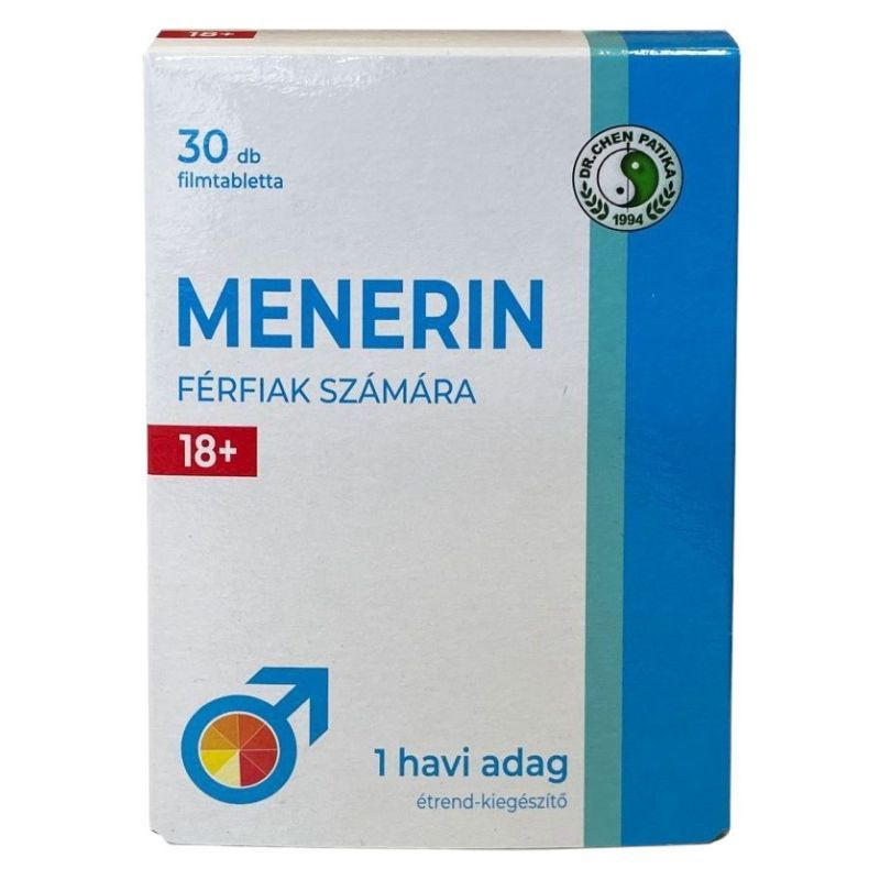 A Dr. Chen Menerin filmtabletta étrend‑kiegészítő férfiak számára, napi 1 tablettában 535 mg L‑arginint, 150 mg maca kivonatot, 150 mg ashwagandhát, 50 mg ginzenget, 11 mg cinket és 55 µg szelént tartalmaz.