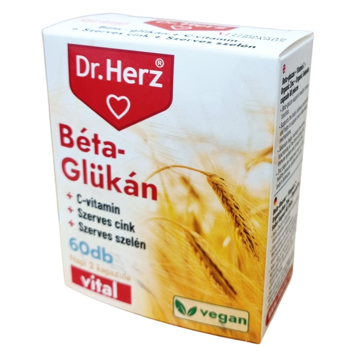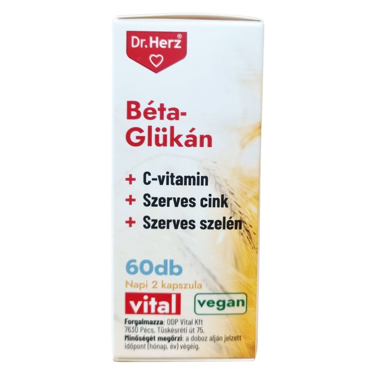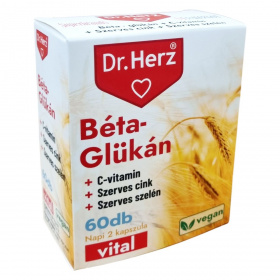 A Dr.Herz® Béta-Glükán + C-vitamin + Szerves cink + Szerves szelén kapszula egy olyan étrend-kiegészítő, amely 2 kapszula napi adagban béta-glükánt (1,3/1,6 D), C-vitamint, szerves szelént és szerves cinket tartalmaz. Ezek a hatóanyagok együttesen támogathatják az immunrendszer normál működését, hozzájárulhatnak a sejtek oxidatív stresszel szembeni védelméhez, valamint segíthetik a haj és köröm egészséges állapotának fenntartását. A béta-glükán támogatja a szervezet védekezőképességét és az anti-gyulladásos mechanizmusokat, a szelén és a cink a normál immunrendszeri funkciókat, míg a C-vitamin az antioxidáns védekezést erősítheti. A kapszula összetevői között szerepelnek természetes eredetű anyagok, mint az élesztőgomba kivonat és a szerves formában jelenlévő nyomelemek, valamint a kapszulahéj is növényi alapú, így a termék vegán életmódot követők számára is alkalmas lehet.