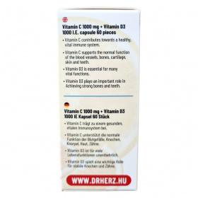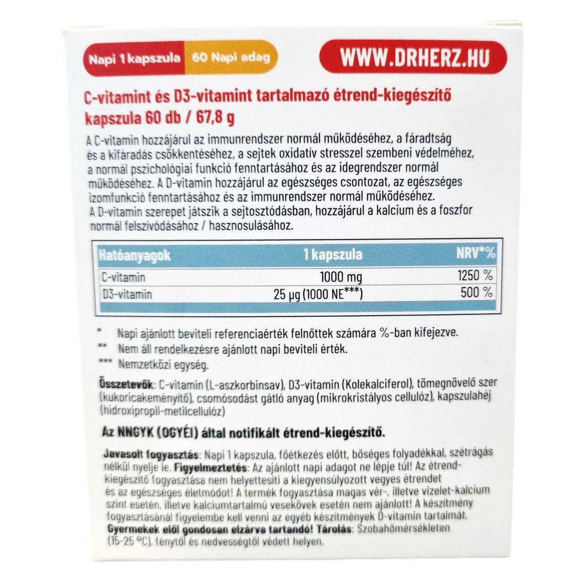 Ez a C-vitamin és D3-vitamin tartalmú étrend-kiegészítő kapszula hozzájárulhat az immunrendszer normál működéséhez, a fáradtság és a kifáradás csökkentéséhez, a sejtek oxidatív stresszel szembeni védelméhez, valamint a normál pszichológiai funkció és idegrendszer fenntartásához. A D-vitamin szerepet játszhat a sejtosztódásban, valamint a kalcium és foszfor normál felszívódásában és hasznosulásában. A készítmény hozzájárulhat az egészséges izomfunkció fenntartásához, és az immunrendszer támogatásához. Tartalmaz 60 kapszulát, melyek egyenként 1000 mg C-vitamint és 1000 NE (25 µg) D3-vitamint biztosítanak. Az ajánlott napi adag betartása mellett fogyasztandó, nem helyettesíti a kiegyensúlyozott étrendet és az egészséges életmódot.