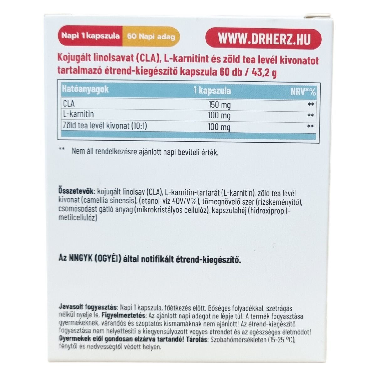 A Dr.Herz® CLA + L-karnitin + Zöld Tea levél kivonat kapszula egy 60 darabos kiszerelésű étrend-kiegészítő, mely konjugált linolsavat (CLA), L-karnitint és zöld tea levél kivonatot tartalmaz. A CLA linolsav, amely támogathatja az anyagcserét és hozzájárulhat a megfelelő koleszterinszint fenntartásához. Az L-karnitin szerepet játszik a zsírsavak sejtek mitokondriumaiba történő szállításában, ezáltal elősegítheti az energiatermelést. A zöld tea levél kivonat hozzájárulhat az alvás közbeni anyagcsere és energiapazarlás támogatásához, valamint a zsírok oxidációjához, ami segítheti a testsúly kontrollját. A készítmény kapszulahéja növényi eredetű, így vegán étrendbe is beilleszthető. A termék szedése javasolt főétkezés előtt, egy kapszulával, bőséges folyadékkal. Fontos betartani a javasolt napi adagot, továbbá gyermekek, várandós és szoptatós nők számára nem ajánlott. Az étrend-kiegészítő alkalmazása nem helyettesíti a kiegyensúlyozott és vegyes étrendet, valamint az egészséges életmódot.