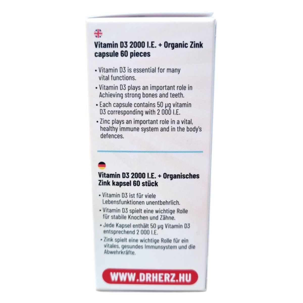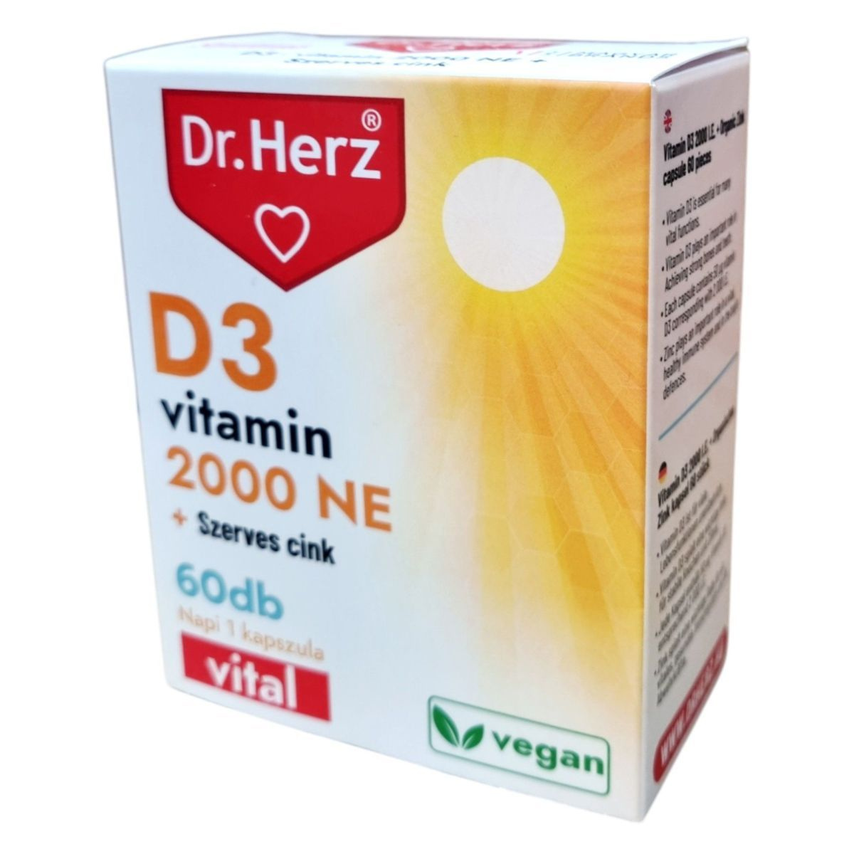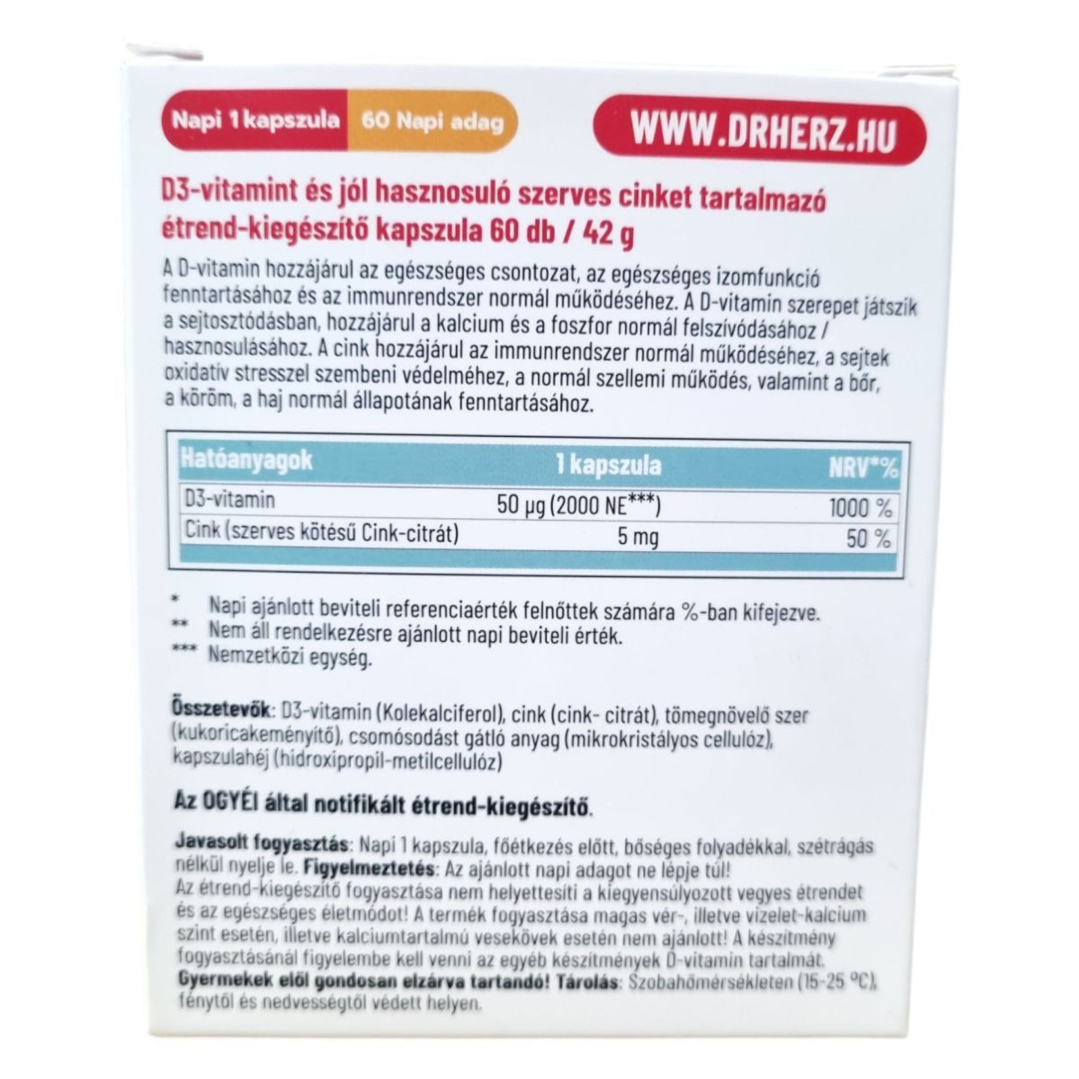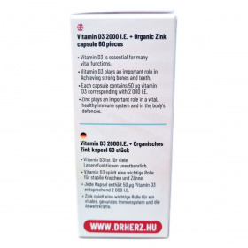 A Dr. Herz D3 vitamin 2000 NE + Szerves cink kapszula egy étrend-kiegészítő, amely D3-vitamint és jól hasznosuló szerves cinket tartalmaz. A D-vitamin hozzájárulhat az egészséges csontozat, izomfunkció és az immunrendszer normál működéséhez, valamint szerepet játszhat a sejtosztódásban és a kalcium, foszfor normál felszívódásában. A cink hozzájárulhat az immunrendszer normál működéséhez, a sejtek védelméhez, a normál szellemi működéshez, valamint a bőr, köröm és haj normál állapotának fenntartásához. A termék napi ajánlott mennyisége 1 kapszula, amelyet főétkezés előtt, bőséges folyadékkal, szétrágás nélkül kell bevenni. A termék bio és vegán étrendi irányzatoknak is megfelelhet.