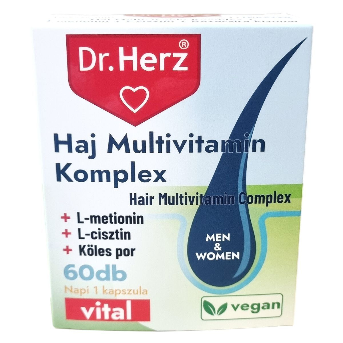 A Dr.Herz Haj Multivitamin Komplex speciális étrend-kiegészítő kapszula, amely búzacsíra kivonatot, köles port, L-cisztint, L-metionint és jól hasznosuló szerves cinket tartalmaz. A B5-vitamin részt vehet a normál energiatermelő folyamatokban, míg a B6-vitamin hozzájárulhat a normál cisztein-anyagcseréhez. A B7-vitamin a normál anyagcserében játszhat szerepet, és támogathatja a haj normál állapotának fenntartását. A cink védelmet nyújthat a sejtek oxidatív stresszel szemben, valamint hozzájárulhat a bőr, köröm és haj egészségéhez. A készítmény L-metionin és L-cisztin tartalma elősegítheti a haj vitalitását és erősítését, miközben antioxidáns hatású lehet. A kapszula napi egyszeri adagolásra ajánlott, vegán összetétele révén széles körben alkalmazható a haj ápolására és támogatására.