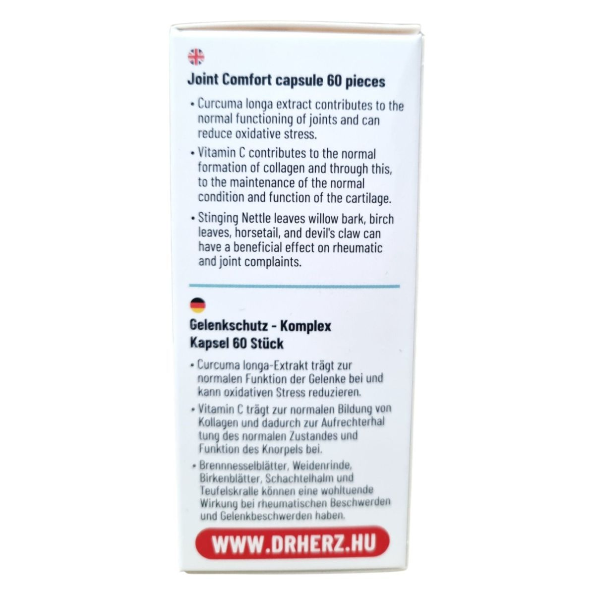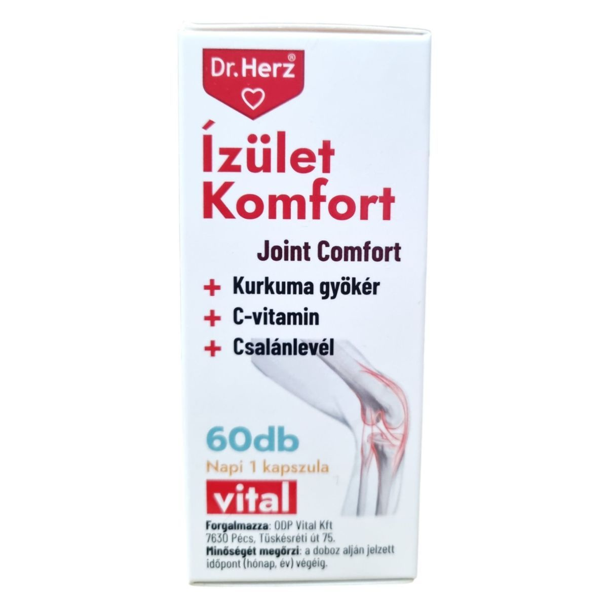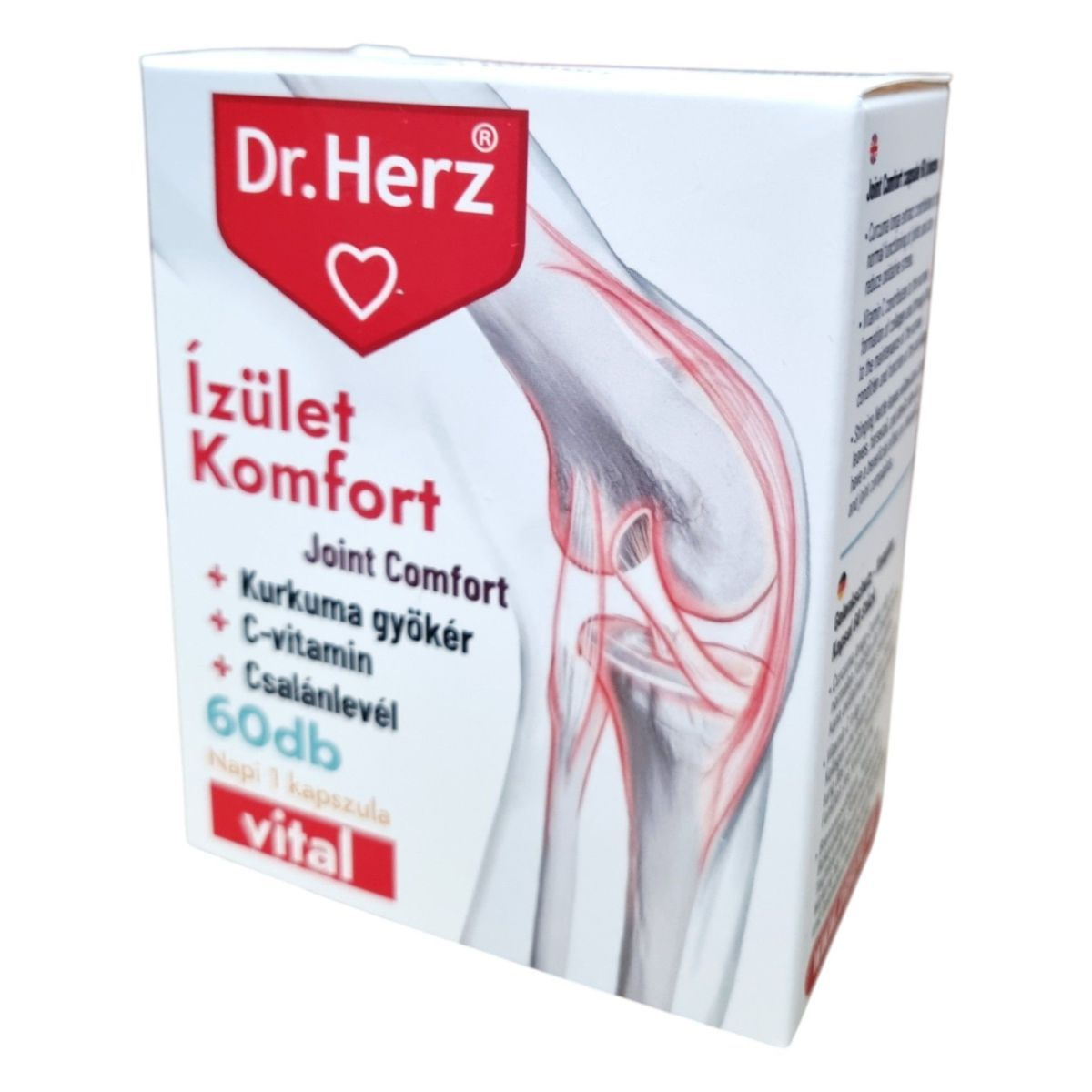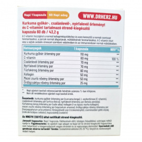 A Dr. Herz Ízület Komfort kapszula egy komplex étrend-kiegészítő, amely kurkuma gyökér, C-vitamin, csalánlevél, nyírfalevél, fűzfakéreg, kollagén, mezei zsurló és ördögcsáklya növényi összetevőket tartalmaz. A termék célja, hogy támogassa az ízületek normál működését és a porcok egészségét. A C-vitamin hozzájárulhat a normál kollagénképződéshez, ami fontos a csontozat és a porcok normál állapotának fenntartásához. A termék összetevői között található kurkuma gyökér és csalánlevél hozzájárulhatnak az ízületek egészségéhez és az oxidatív stressz csökkentéséhez.