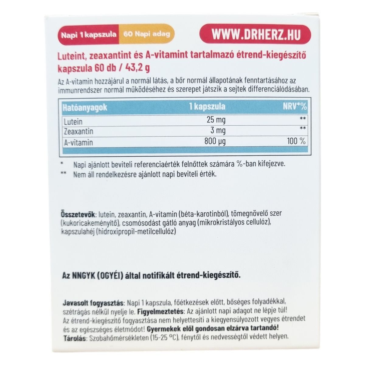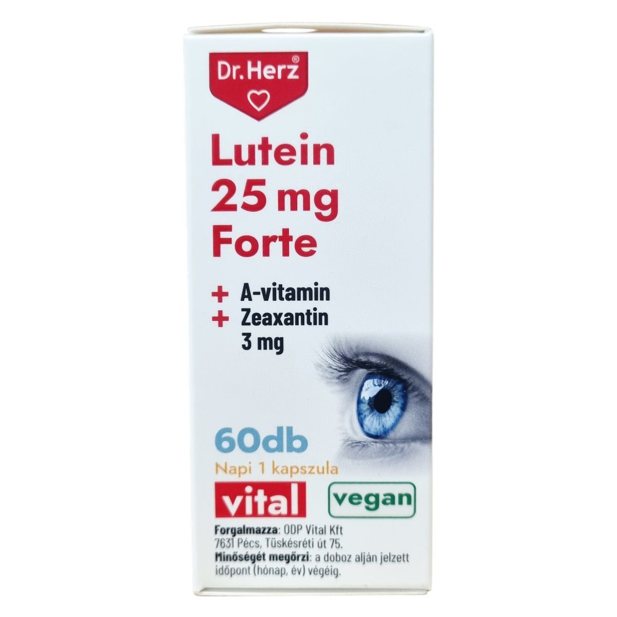 A Dr.Herz Lutein 25 mg Forte + Zeaxantin + Vitamin A kapszula komplex formulája hozzájárulhat a szem egészségének megőrzéséhez, a normál látás fenntartásához és a sejtek oxidatív stresszel szembeni védelméhez. A lutein és a zeaxantin elősegítheti a normál vizuális egészséget azáltal, hogy semlegesítheti az UV-kék fény által előállított szabad gyököket. A-vitamin szerepet játszhat a fény és sötétség közötti különbség felismerésében és hozzájárulhat az egészséges látás fenntartásához. Az ajánlott napi adag egy kapszula, melyet főétkezések előtt kell bevenni bőséges folyadékkal, szétrágás nélkül. A termék összetevői között megtalálhatóak a természetes növényi eredetű anyagok, mikrokristályos cellulóz, kukoricakeményítő és egy növényi eredetű kapszulahéj is. A termék vegán étrendbe illeszthető, és megfelel az OGYÉI előírásainak.