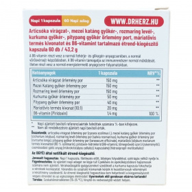 A Dr.Herz® Máj Komplex egy természetes összetevőkből álló étrend-kiegészítő kapszula, amely 60 darabos kiszerelésben kerül forgalomba. Hatóanyagai között szerepel az articsóka, amely támogatja a máj és epe működését, valamint serkenti az epe termelését. A mezei katáng, rozmaring, kurkuma és pitypang gyökér hozzájárulhat az anyagcsere folyamatokhoz. A máriatövis antioxidáns hatása révén segítheti a máj regenerációját, míg a B6-vitamin részt vesz a normál fehérje- és glikogén-anyagcserében, a vörösvérsejt-képződésben és az immunrendszer támogatásában. A termék vegán összetételű, napi egy kapszula fogyasztása javasolt főétkezések előtt. A kapszula növényi eredetű héjjal készül, és mentes minden állati eredetű összetevőtől.