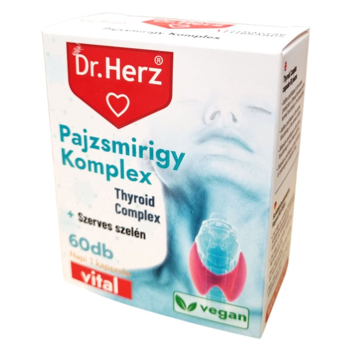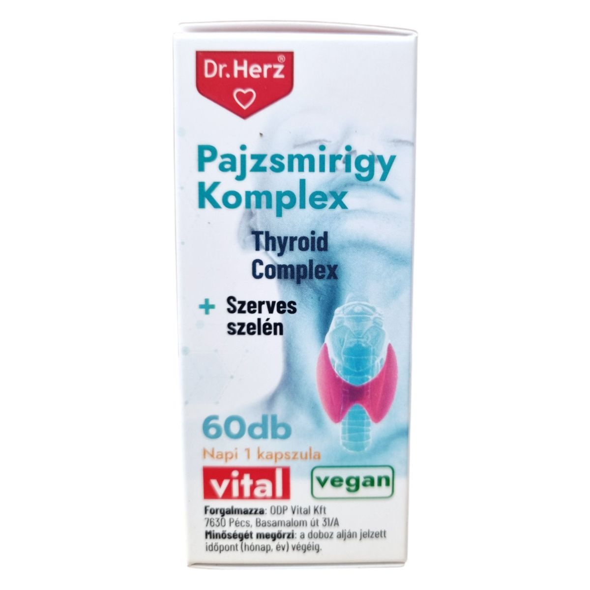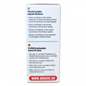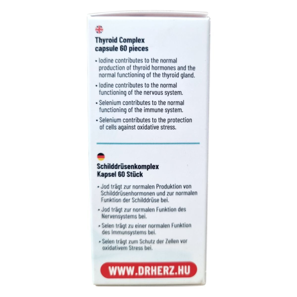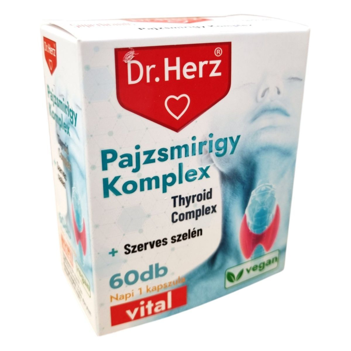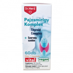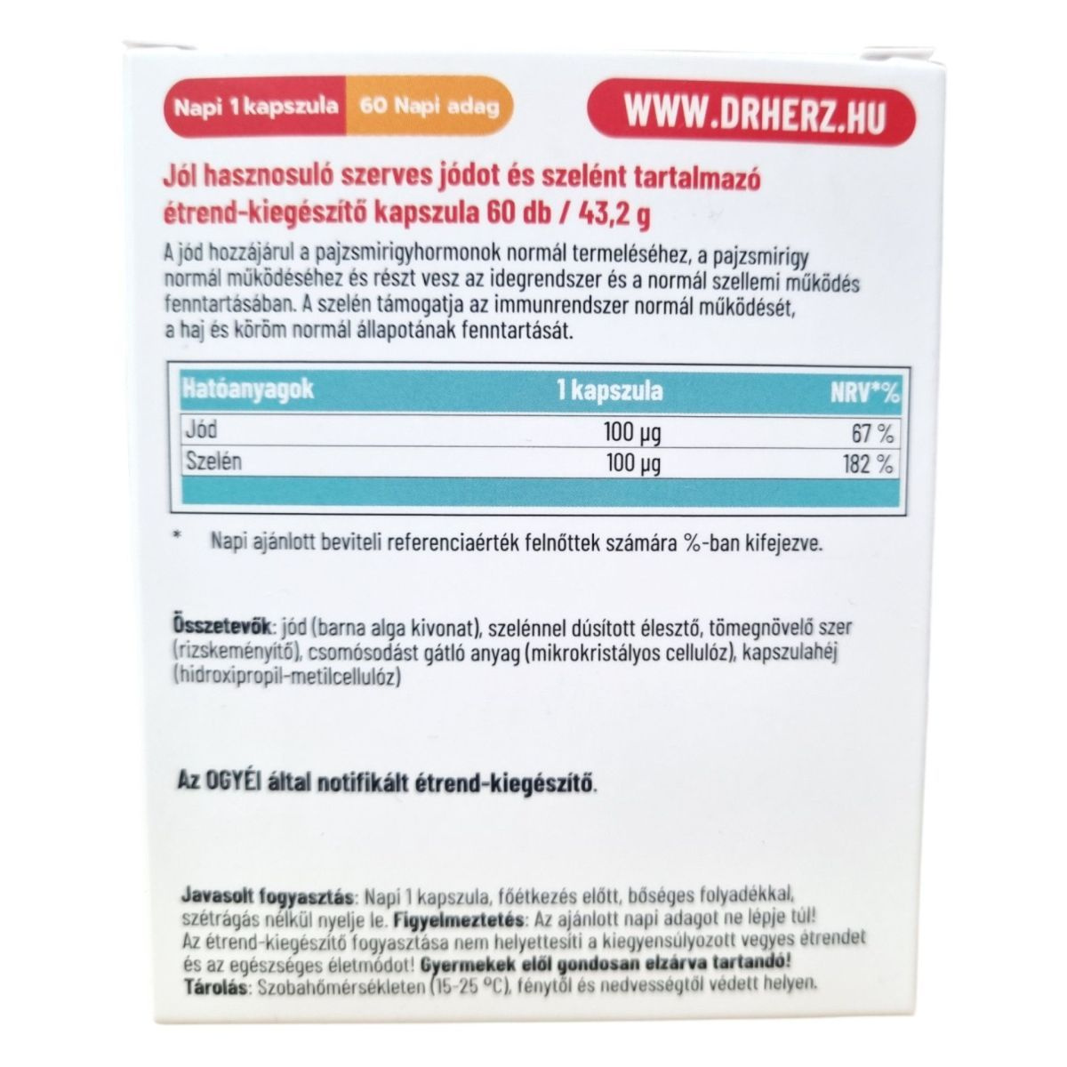A Dr. Herz Pajzsmirigy Komplex egy jól hasznosuló szerves jódot és szelént tartalmazó étrend-kiegészítő, amely 60 kapszulát tartalmaz. A jód hozzájárulhat a pajzsmirigyhormonok normál termeléséhez és a pajzsmirigy normál működéséhez, valamint részt vehet az idegrendszer és a normál szellemi működés fenntartásában. A szelén támogathatja az immunrendszer normál működését, valamint a haj és köröm normál állapotának fenntartását. A termék vegán étrendbe illeszthető, és az OGYÉI által notifikált étrend-kiegészítő.