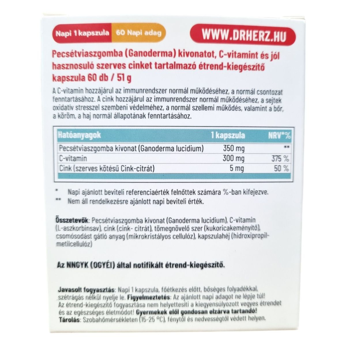 A Dr. Herz Reishi Pecsétviaszgomba kapszula egy természetes alapanyagokból készült étrend-kiegészítő, amely pecsétviaszgomba kivonatot, C-vitamint és szerves cinket tartalmaz. A termék napi egy kapszula fogyasztását javasolja, amely hozzájárulhat az immunrendszer normál működéséhez, a csontozat fenntartásához, valamint a bőr, a köröm és a haj normál állapotának megőrzéséhez. A termék bio és vegán étrendi irányzatoknak is megfelel, és szobahőmérsékleten tárolandó. Forgalmazója az ODP Vital Kft, és az OGYÉI által notifikált termék.