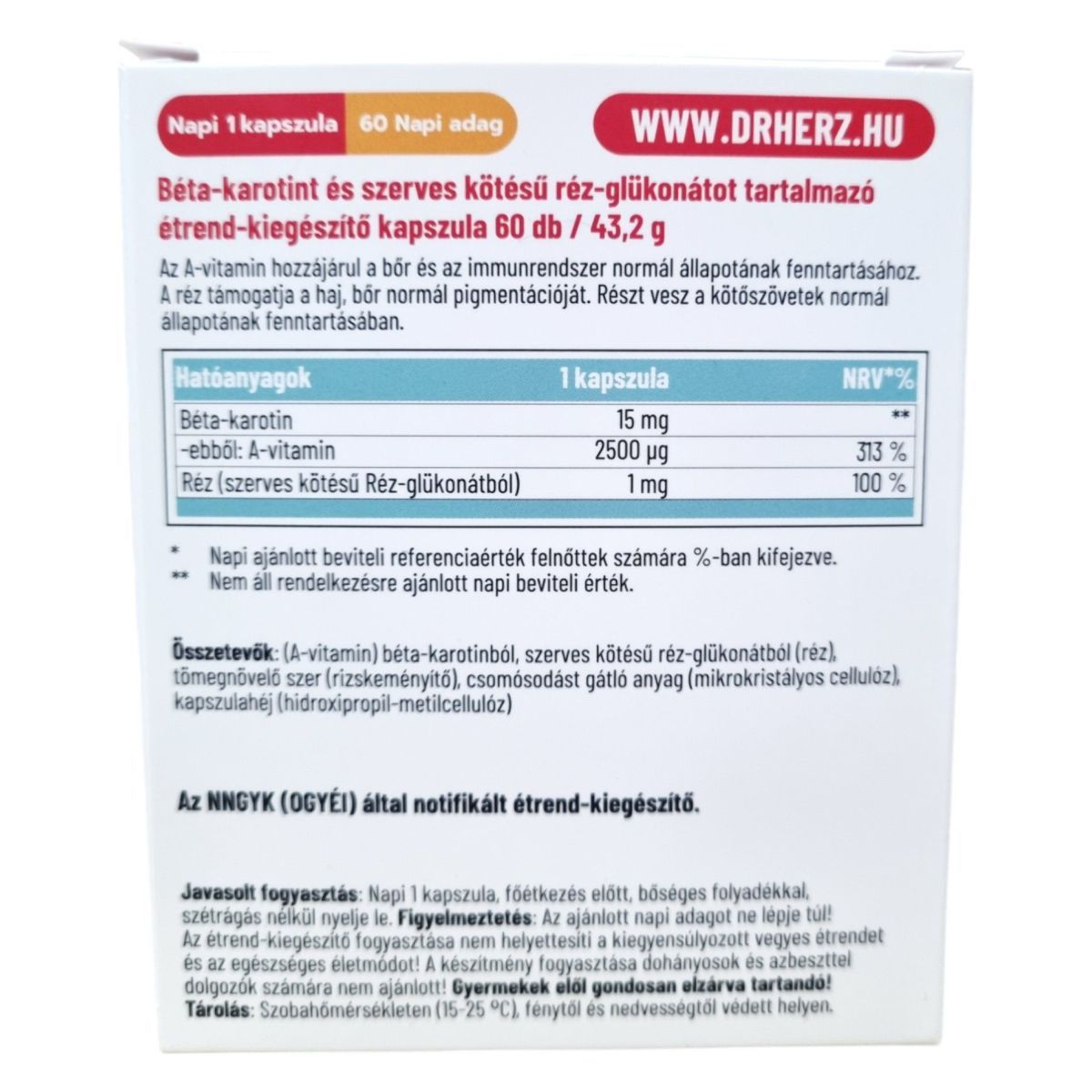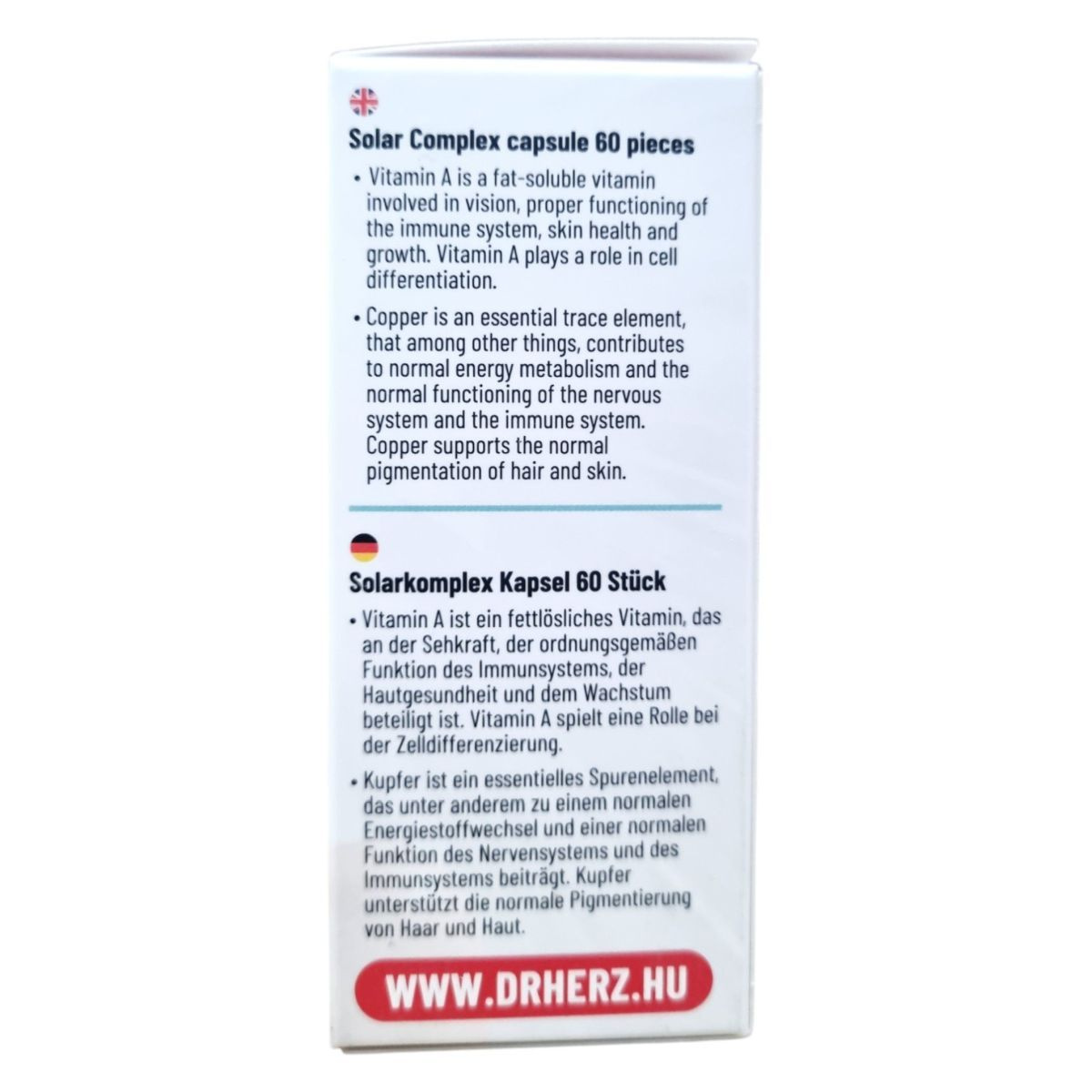 A Dr. Herz Solar Complex kapszula béta-karotint és szerves kötésű réz-glükonátot tartalmaz, amelyek hozzájárulhatnak a bőr és az immunrendszer normál állapotának fenntartásához, valamint a haj és bőr normál pigmentációjának támogatásához. Az A-vitamin egy zsírban oldódó vitamin, amely szerepet játszhat a látásban, az immunrendszer megfelelő működésében, a bőr egészségében és a sejtek differenciálódásában. A réz egy esszenciális nyomelem, amely hozzájárulhat a normál energia-anyagcseréhez és az idegrendszer normál működéséhez. A termék vegán étrendbe illeszthető, és napi egy kapszula fogyasztása ajánlott.