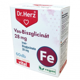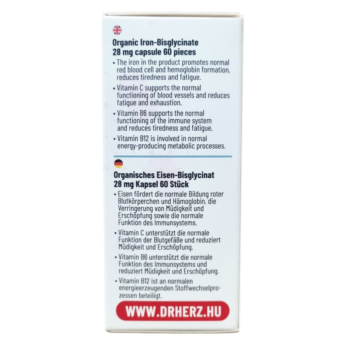 A Dr.Herz Vas-Biszglicinát kapszula jól hasznosuló szerves vas-biszglicinátot, C-vitamint, B6-vitamint és B12-vitamint tartalmaz. A C-vitamin hozzájárul a normál energiatermelő anyagcsere-folyamatokhoz és a normál pszichológiai funkció fenntartásához. A vas elősegítheti a normál vörösvérsejt- és hemoglobin-képződést, csökkentheti a fáradtságot és kifáradást, valamint támogathatja az immunrendszer normál működését. A B6-vitamin segítheti az immunrendszert és mérsékelheti a kifáradást, míg a B12-vitamin részt vehet a normál energiatermelő anyagcsere-folyamatokban és a vörösvérsejt-képződésben. A termék szedése napi egy kapszula ajánlott főétkezés előtt, bőséges folyadékkal. A kapszulahéj hidroxipropil-metilcellulózból áll, a termék vegán étrendbe is beleilleszthető.