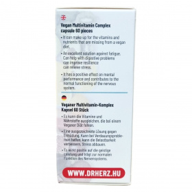 A Dr.Herz Vegan Multivitamin Komplex + C-vitamin + D-vitamin kapszula kifejezetten a vegán étrendet követők számára készült, hogy pótolja a szervezet számára fontos vitaminokat és ásványi anyagokat. Hozzájárulhat az immunrendszer normál működéséhez, a szellemi működés fenntartásához és az idegrendszer megfelelő működéséhez. A termék segítheti a fáradtság leküzdését, támogathatja az emésztést, javíthatja a szervezet terhelhetőségét és csökkentheti a stresszt. Napi egy kapszula fogyasztása ajánlott, főétkezés előtt, bőséges folyadékkal. A készítmény nem helyettesíti a változatos étrendet és az egészséges életmódot.