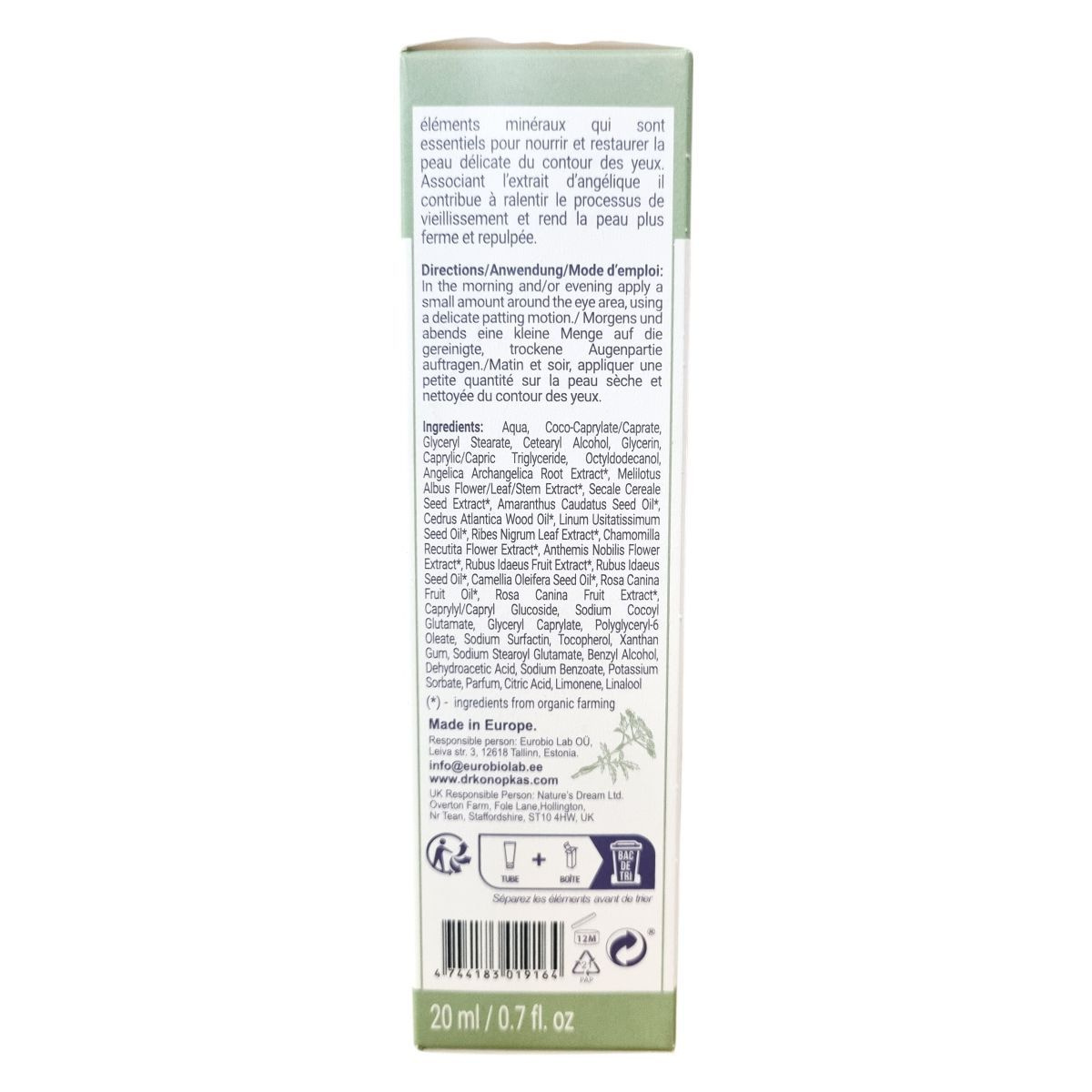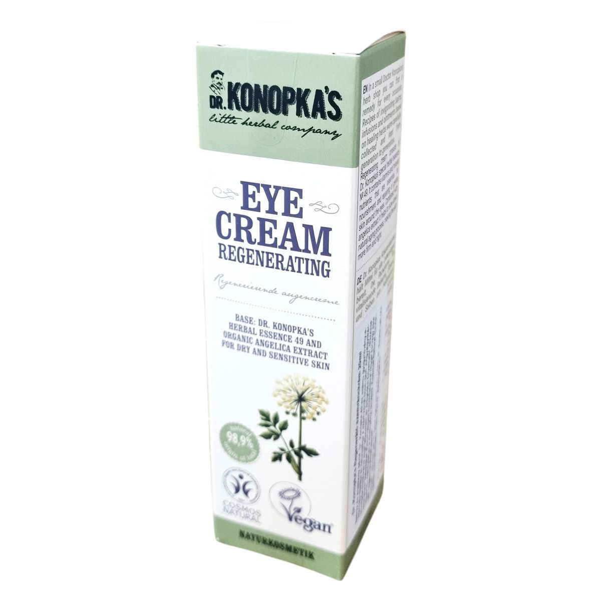 A Dr. Konopka’s regeneráló szemránckrém Dr. Konopka speciális gyógynövényes esszenciáján alapul, amely vitaminokat és ásványi anyagokat tartalmaz. Ezek elengedhetetlenek a szem körüli finom bőr táplálásához és regenerálásához. Az angyalgyökér kivonattal kombinálva segít lassítani a természetes öregedési folyamatokat, valamint feszesebb és teltebb megjelenést kölcsönöz a bőrnek. A termék 98,9%-ban természetes eredetű összetevőket tartalmaz, Európában készült.