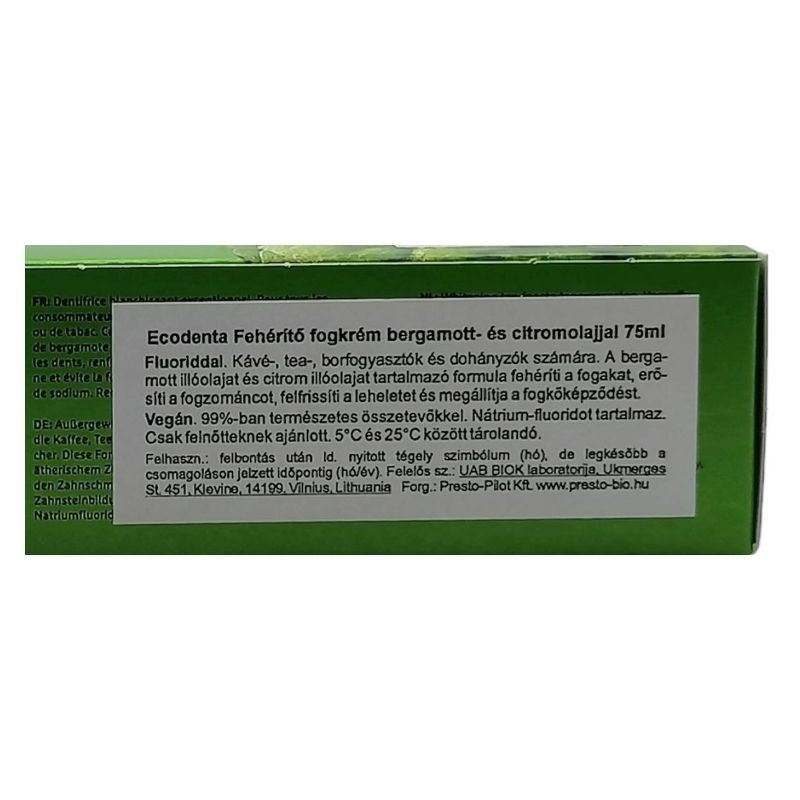 Összetevők: Glycerin, Hydrated Silica, Aqua, Hydroxyapatite, Disodium Cocoyl Glutamate, Citrus Aurantium Bergamia (Bergamot) Fruit Oil, Citrus Limon (Lemon) Peel Oil, Xanthan Gum, Sodium Fluoride (1448 ppm F Ż), Aroma, Sodium Saccharin, Citral, Limonene, Linalool.