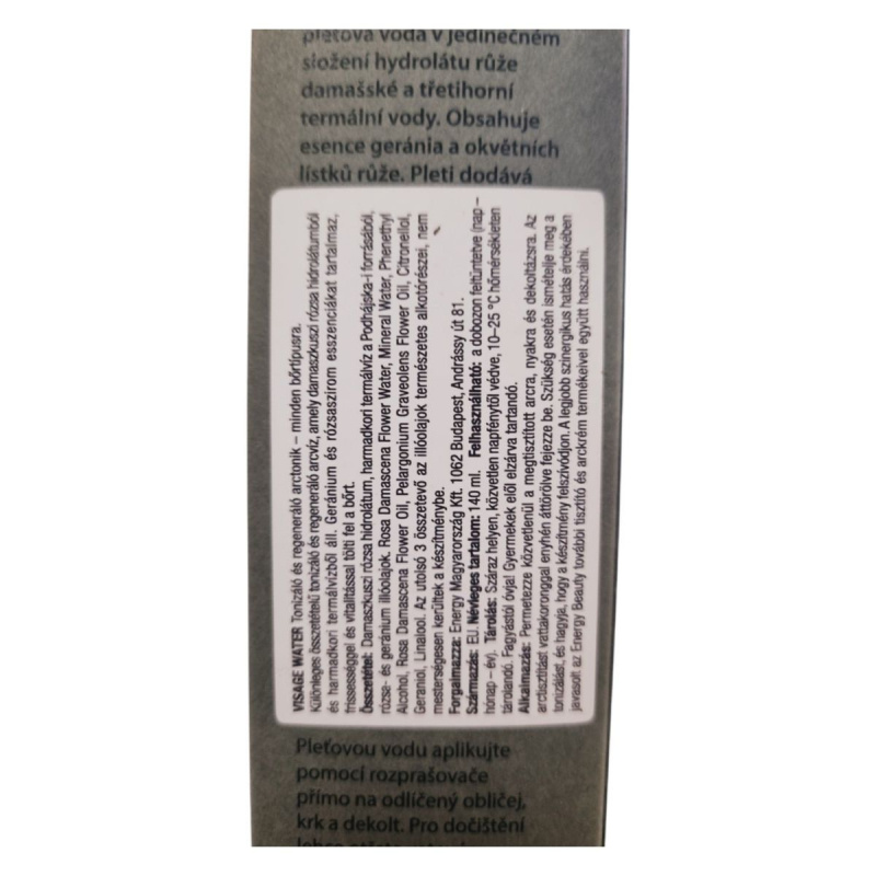 A Visage Water egy különleges összetételű tonizáló és regeneráló arctonik, amely damaszkuszi rózsahidrolátumot és harmadkori termálvizet tartalmaz. Az esszenciák, mint a geránium és a rózsaszirom, hozzájárulhatnak a bőr vitalitásának és regenerációjának támogatásához. A termék minden bőrtípusra ajánlott, és a legjobb eredmény érdekében más Energy Beauty tisztító termékekkel és krémekkel kombinálva használható.