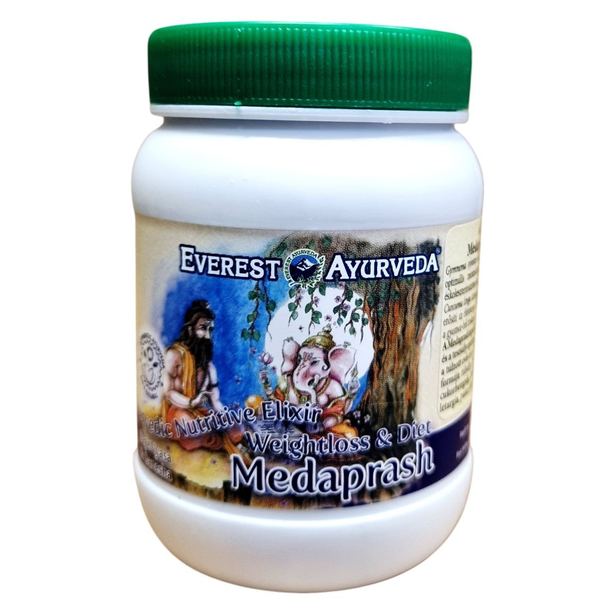 A Medaprash egy ájurvédikus táplálkozási elixír, amely a zsírszövet redukciójára és a testsúly optimalizálására készült. A termék különböző gyógynövényeket tartalmaz, mint például a Gymnema sylvestre, amely hozzájárulhat a testsúly csökkenéshez, és a Terminalia bellirica, amely normalizálhatja a glükóz- és koleszterinszintet. Az Inula helenium csökkentheti az étvágyat és segítheti a vízkiválasztást, míg a Curcuma longa támogathatja a májműködést és a zsír lebontását. Az ájurvéda szerint a szervezet hét testszövetének táplálása és felépítése az emésztésen keresztül történik, és ezek táplálkozási ciklusa öt nap. A termék származási helye Nepál, és Magyarországon az Everest Herba s.r.o. forgalmazza.