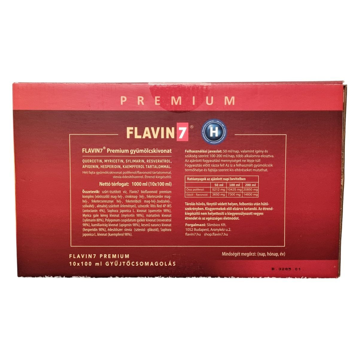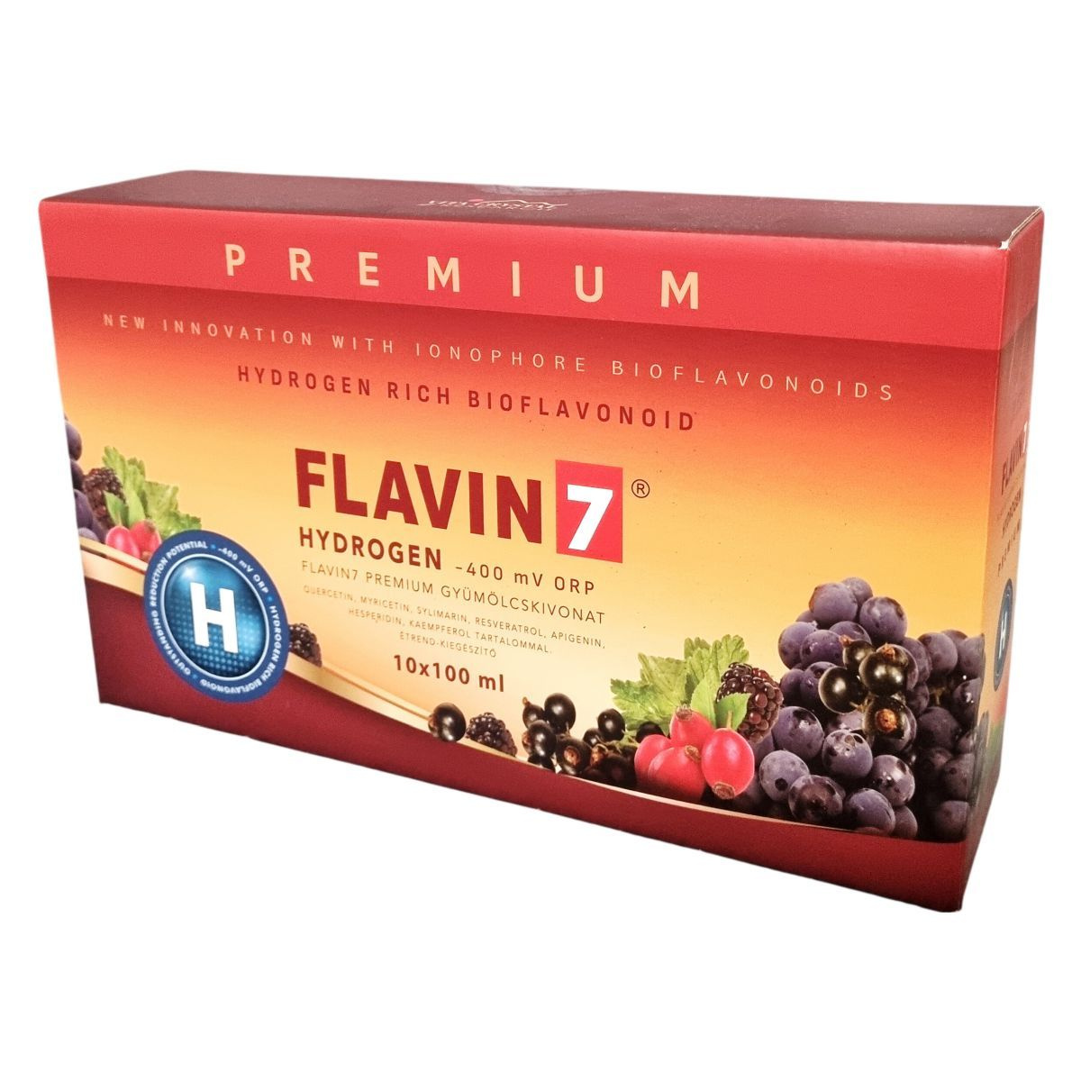A Flavin7 Premium gyümölcskivonat hétféle gyümölcsből származó polifenol- és flavonoid-tartalmú bioflavonoid komplexet tartalmaz. Hidrogénben gazdag bioflavonoid összetétele antioxidáns potenciálra utaló -400 mV ORP értékkel kerül bemutatásra. Az ital stevia édesítőszerrel készül, íze a felhasznált gyümölcsök termőhelye és fajtája szerint eltérhet.