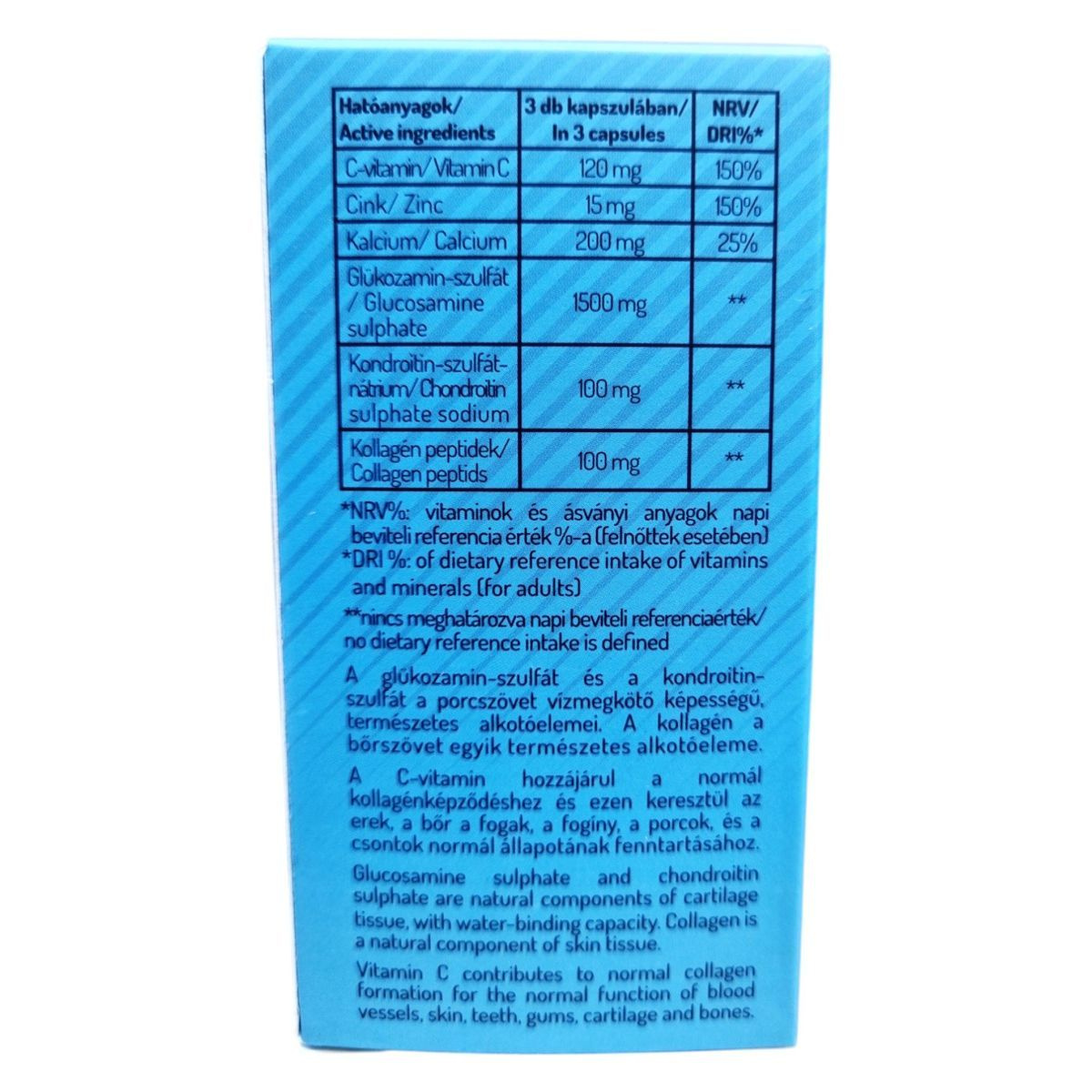 Ez az étrend-kiegészítő glükozamin-szulfátot, kondroitin-szulfátot, C-vitamint, kalciumot, cinket és kollagént tartalmazhat, amelyek hozzájárulhatnak a porcok és a bőr normál állapotának fenntartásához.