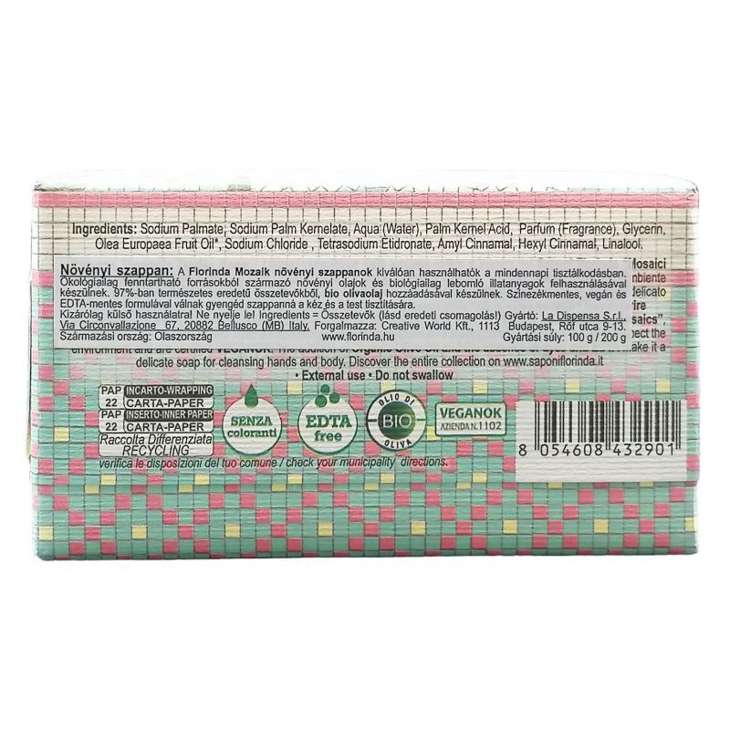 A Florinda Mozaik növényi szappanok kiválóan használhatók a mindennapi tisztálkodásban. Ökológiailag fenntartható forrásokból származó növényi olajok és biológiailag lebomló illatanyagok felhasználásával készülnek. 97%-ban természetes eredetű összetevőket és bio olívaolajat tartalmaznak. Színezékmentes, vegán és EDTA-mentes formulával válnak gyengéd szappanná a kéz és a test tisztítására.