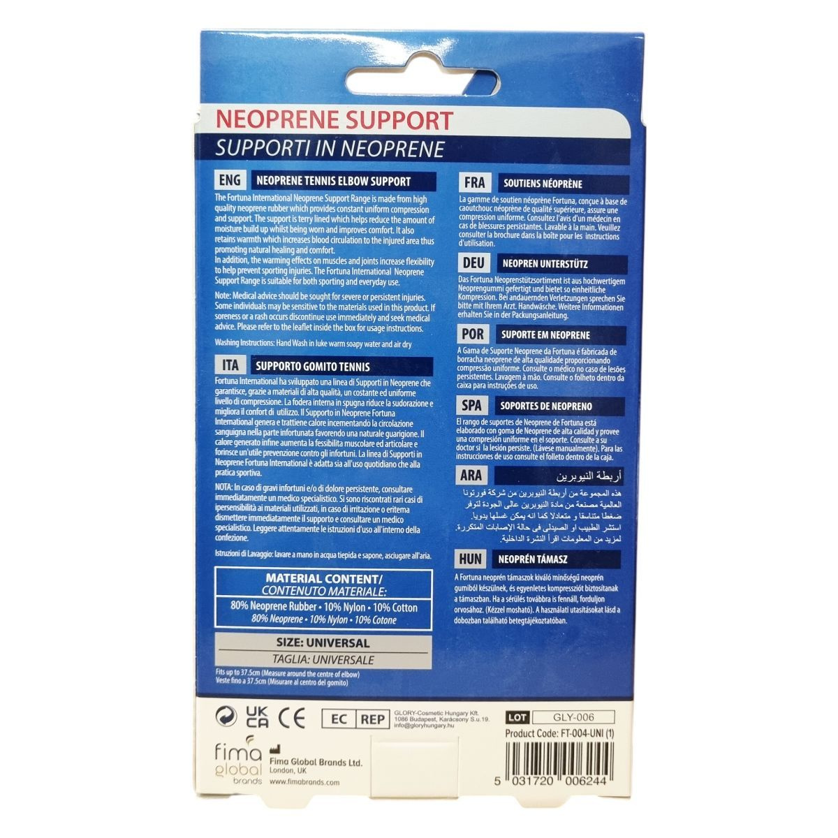 A Fortuna International neoprén támaszok kiváló minőségű neoprén gumiból készülnek, amelyek állandó, egyenletes kompressziót és támogatást nyújtanak. A belső frottír bélés csökkenti az izzadtság felgyülemlését és növeli a komfortérzetet. A támasz megtartja a test melegét, ami serkenti a vérkeringést a sérült területen, elősegítve a természetes gyógyulást és kényelmet biztosít. A meleg hatás javítja az izmok és ízületek rugalmasságát, segítve a sportbalesetek megelőzését. A termék kézzel mosható langyos, szappanos vízben, majd levegőn szárítandó. A termék univerzális méretű, bármelyik könyök középső részén legfeljebb 37,5 cm-es körfogatig használható.
