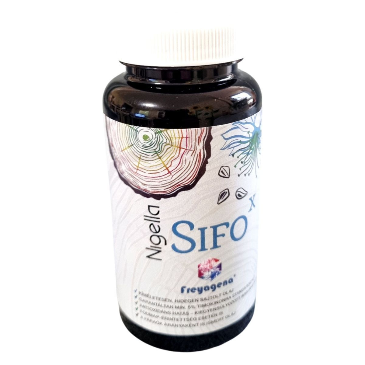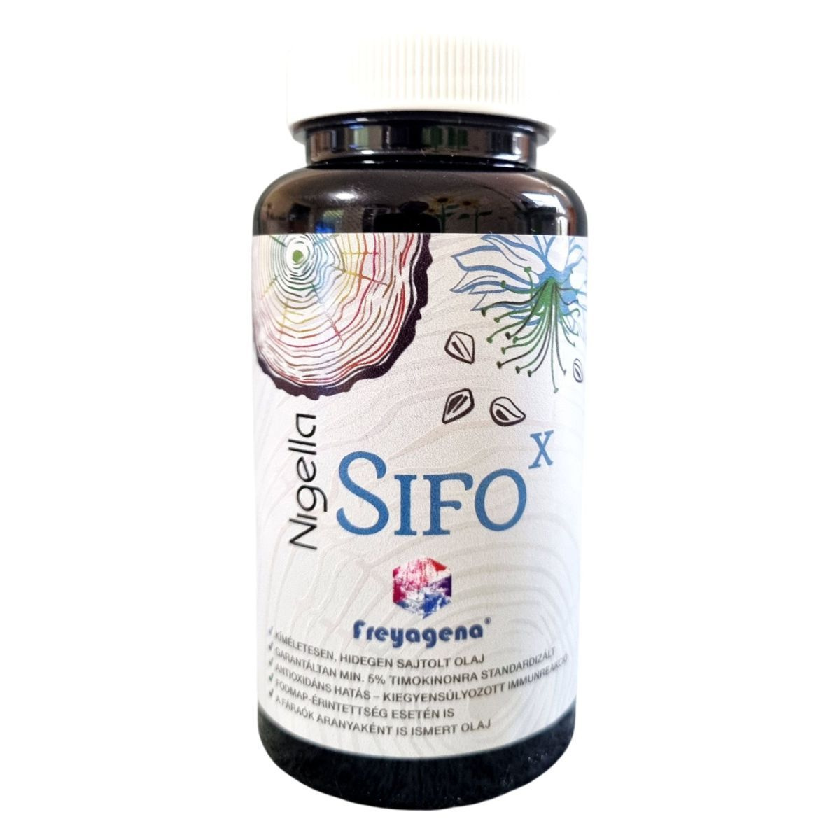 A freyagena® Nigella SIFOx egy Magyarországon fejlesztett és gyártott étrend-kiegészítő, amely hidegen sajtolt feketeköménymag-olajat tartalmaz. Az olaj antioxidáns hatású lehet, és hozzájárulhat a kiegyensúlyozott immunreakcióhoz. A termék FODMAP-érintettség esetén is alkalmazható, és a fáraók aranyaként is ismert olajként van számon tartva. A kapszulák zselatinból készültek, és a termék kizárólagos forgalmazója a Nutribalance Kft., amely Budapesten található.