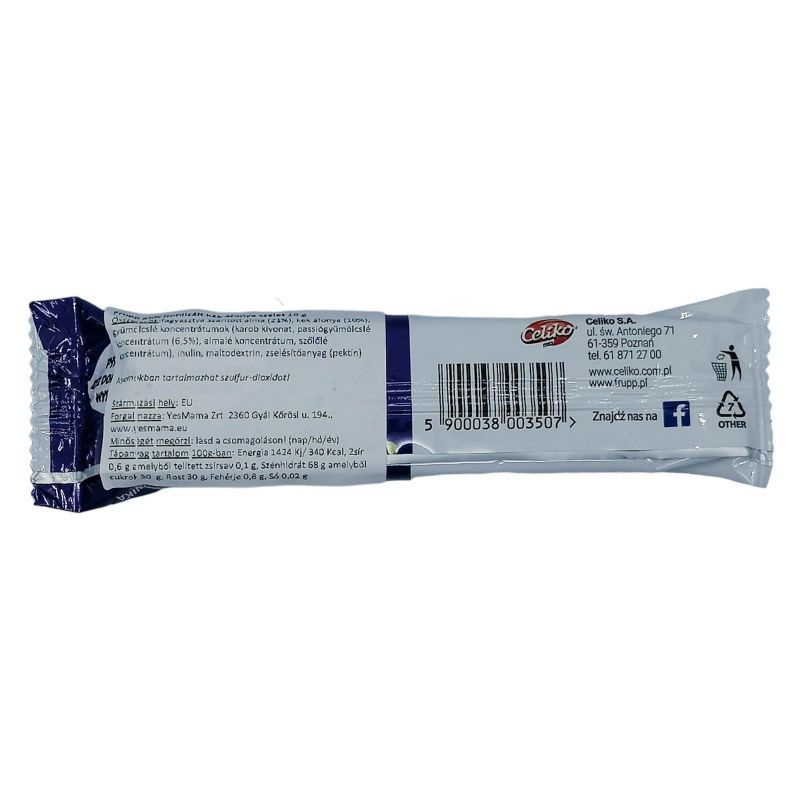 Összetevők: fagyasztva szárított alma (21%), kék áfonya (10%), gyümölcslé koncentrátumok (karob kivonat,passiógyümölcslé koncentrátum (6,5%), almalé koncentrátum, szőlőlé koncentrátum), inulin, maltodextrin, zselésítőanyag (pektin).