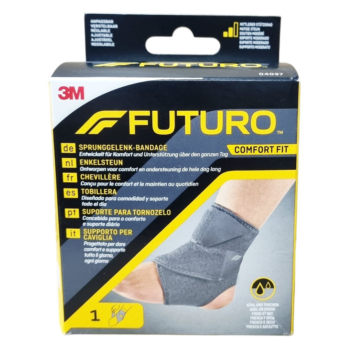 A FUTURO™ Comfort Fit bokarögzítő állítható, közepes támaszt nyújtó kialakítású, könnyű, belépős és elasztikus, négyirányú nyúlású anyagból készülő termék. Kontúros, körbeölelő formája lehetővé teszi a teljes mozgástartományt, miközben stabil tartást biztosít. Légáteresztő és nedvesség-szabályozó tulajdonságai révén segít szárazon tartani a bőrt, lágy belső anyaga kényelmes viseletet garantál napi használatra. Használat előtt és alatt kézi mosással tisztítható 30 fokon, nem szabad fehéríteni, vasalni vagy vegytisztítani. A termék jobb- és balbokán egyaránt használható, és alkalmas mindennapos otthoni, munkahelyi, valamint fizikai tevékenységekhez. Használat közben megjelenő bőrprobléma vagy fájdalom esetén azonnal hagyja abba a használatát és konzultáljon orvosával.