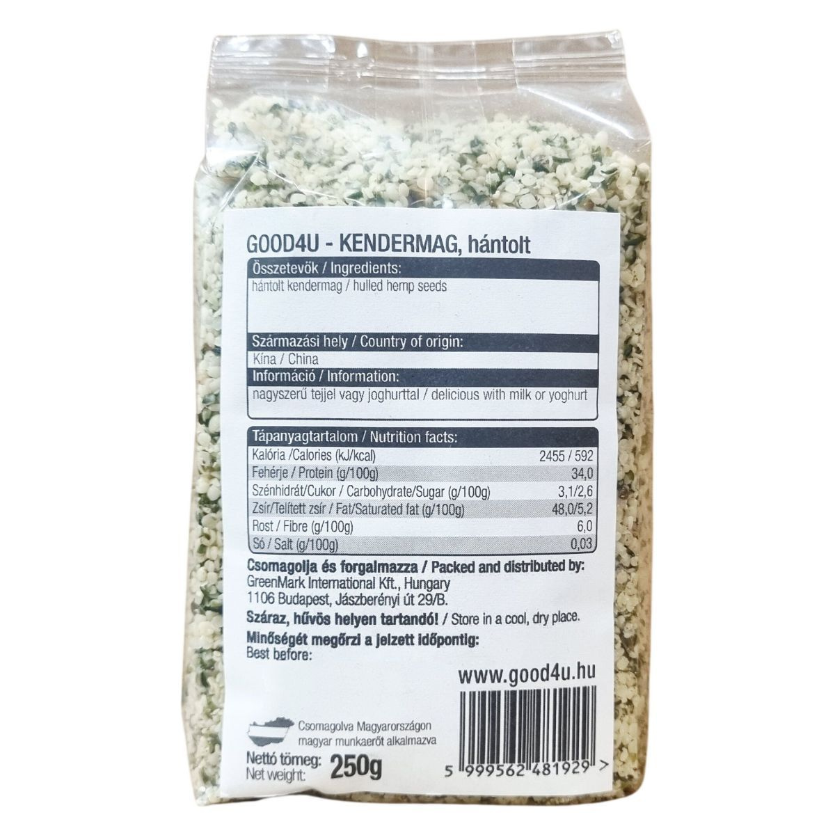 A hántolt kendermag Kínából származik, Magyarországon csomagolják és forgalmazzák. A termék magyar munkaerőt alkalmazva készül, hogy a hazai piac igényeit kiszolgálja. Alkalmas vegán étrendbe is, prémium minőségű, 100%-ban természetes alapanyag. Nettó tömege 250 gramm.