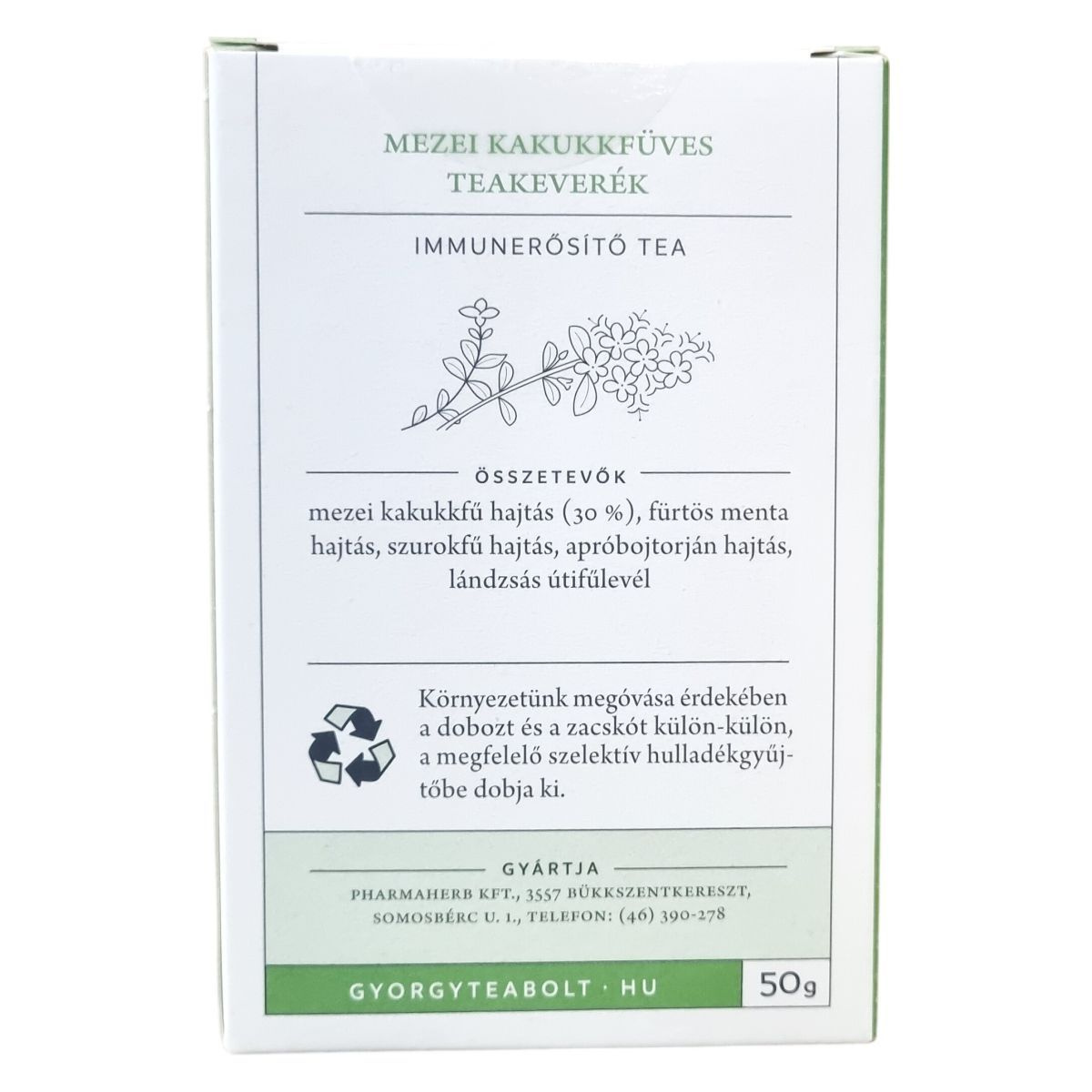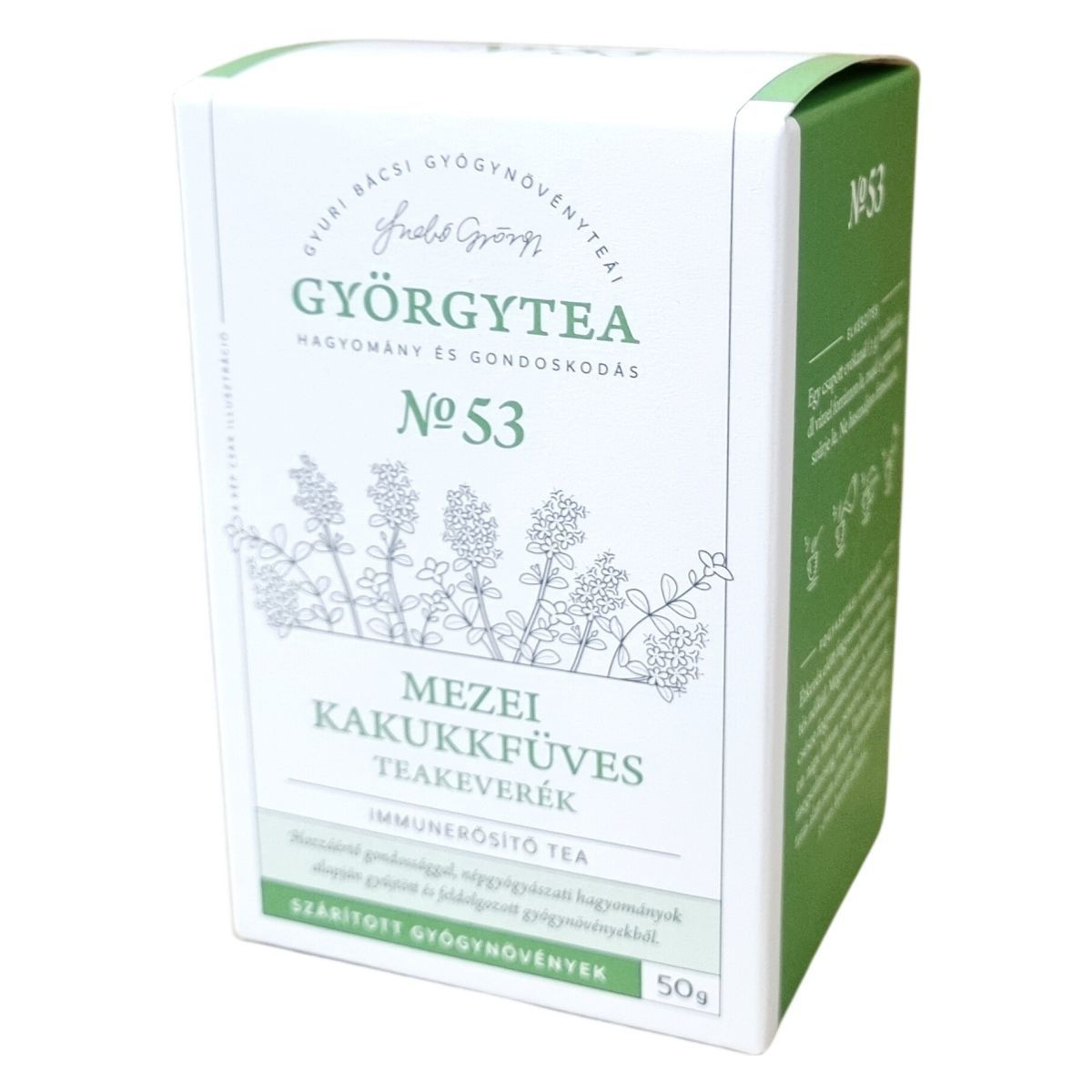 A Gyuri bácsi Györgytea No 53 mezei kakukkfüves immunerősítő teakeverék kiválóan elkészíthető egy evőkanálnyi teafű 2,5 dl forró vízzel való leforrázásával és 15 perc áztatás után szűréssel. A tea hagyományos népgyógyászati módszerek alapján gyűjtött és feldolgozott gyógynövényekből áll, melyek között a mezei kakukkfű dominál 30%-ban, emellett fürtös menta, szurokfű, apróbojtorján és lándzsás útifű található. A tea fogyasztása hozzájárulhat az immunrendszer támogatásához, különösen megelőző jelleggel heti két-három csésze ajánlott, míg panasz esetén kúraszerűen napi három csésze fogyasztható a tünetek megszűnéséig. A termék terhesség és szoptatás idején nem ajánlott, viszont 3 éves kortól gyermekeknek adható. A doboz és a zacskó környezetbarát módon, szelektív hulladékgyűjtőbe helyezendők. Szabó György Magyar Örökség Díjas személyiség gondosságával állították össze, aki úgy vélte, hogy egy-egy csésze gyógynövénytea fogyasztása már hozzájárulhat az egészség megóvásához.