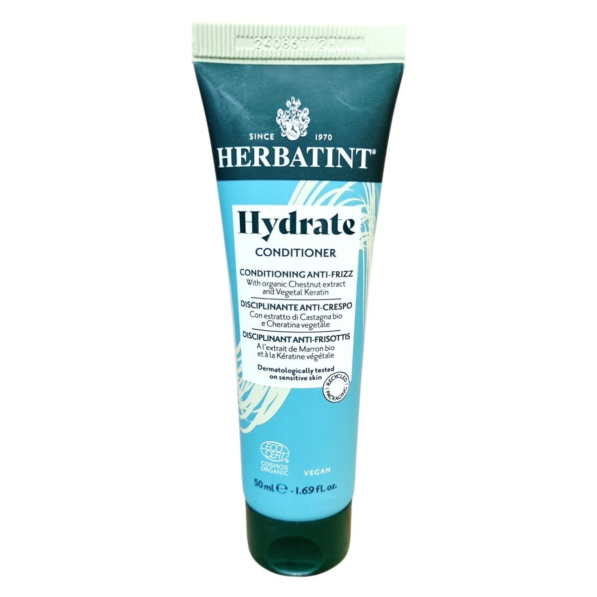 A Herbatint Hydrate Conditioner egy növényi eredetű, hidratáló kondicionáló, amely organikus gesztenye kivonatot és növényi keratint tartalmaz. 99%-ban természetes eredetű összetevők felhasználásával készült, melyből 10% organikus termesztésből származik. Különösen ajánlott érzékeny bőrűek számára, dermatológiailag tesztelt. A termék csomagolása újrahasznosított anyagból készült, így környezetbarát választás. A kondicionáló használatával a haj kezelhetőbbé és simábbá válik, csökkentve a göndörödést és a feszültséget. Olaszországban készül magas minőségű alapanyagok felhasználásával, és megfelel a lig elvárásoknak és minősítéseknek.