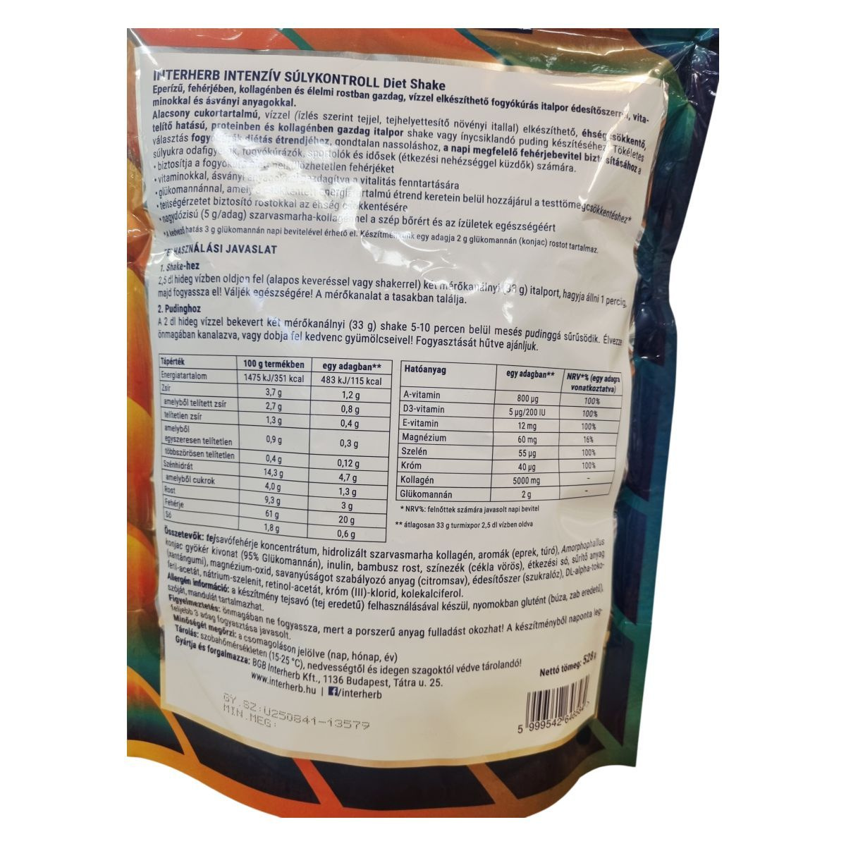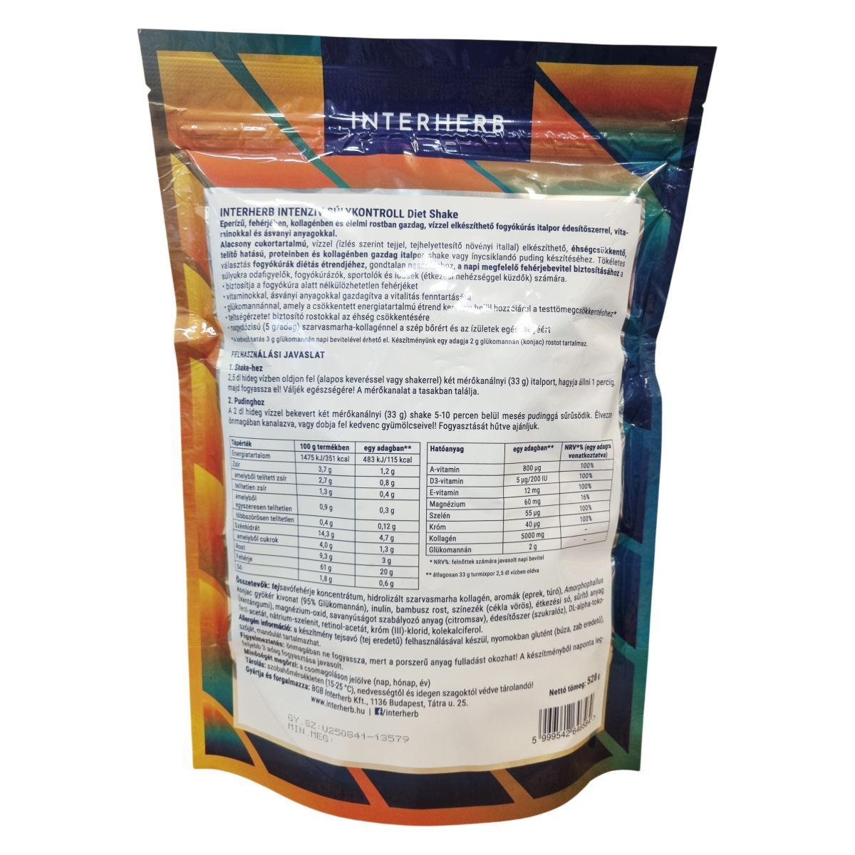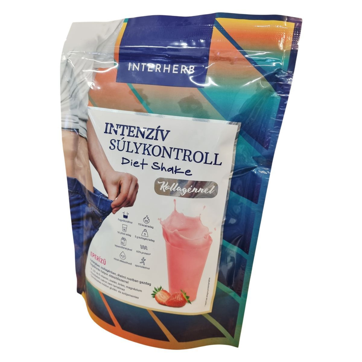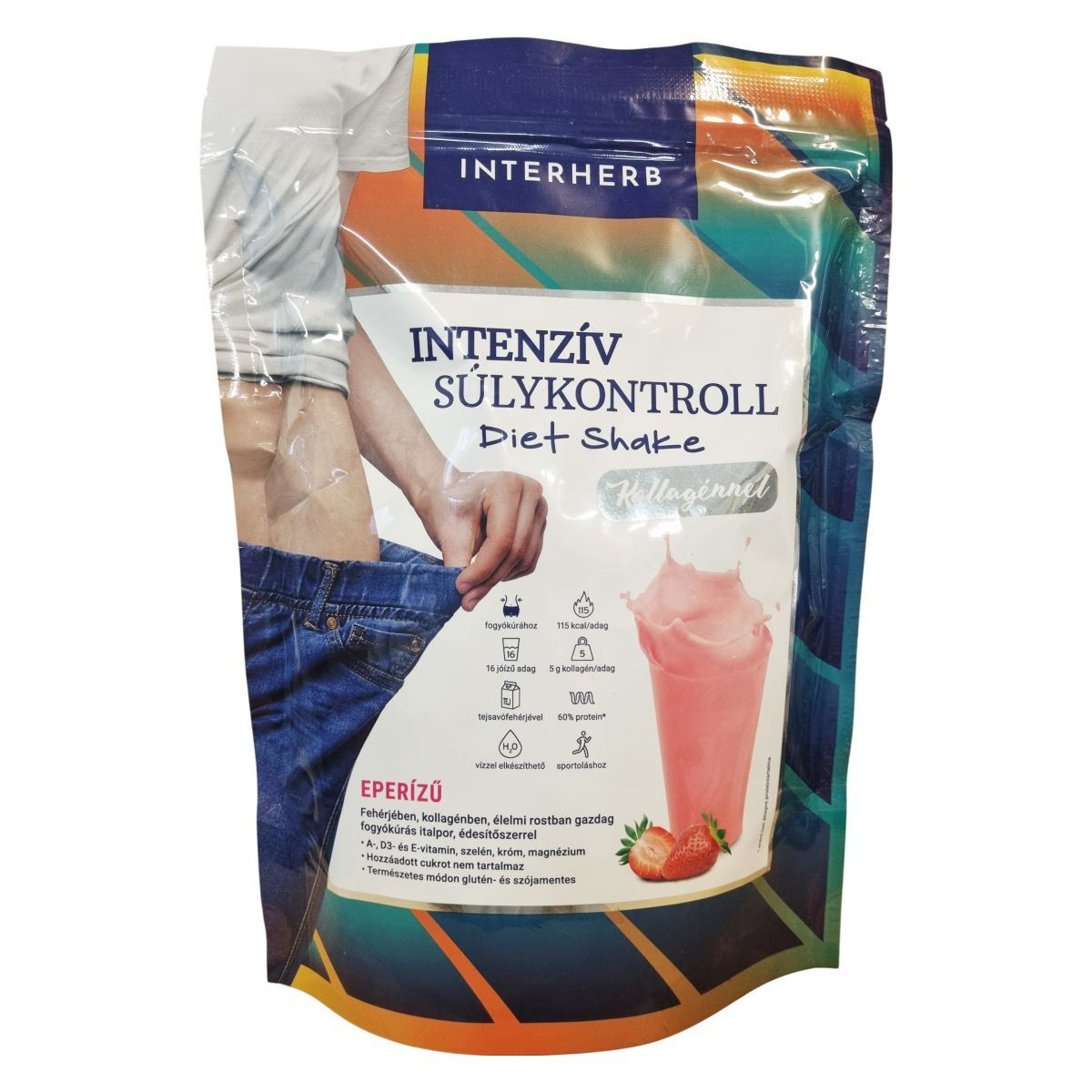 Az Interherb Intenzív Súlykontroll Diet Shake eperízű, fehérjében, kollagénben és élelmi rostban gazdag fogyókúrás italpor. Vízzel elkészítve alacsony cukortartalmú, éhségcsökkentő és telítő hatású, támogatva a diétás étrendet. A termék tejsavófehérje koncentrátumot, hidrolizált szarvasmarha kollagént, valamint glükomannánt és rostokat tartalmaz, melyek hozzájárulhatnak a testtömegcsökkenéshez és az éhségérzet csökkentéséhez. Kétféleképpen fogyasztható: shake formájában vagy pudingként, mely utóbbi 5-10 perc alatt sűrűsödik, és ízlés szerint gyümölcsökkel is kiegészíthető. A készítmény vitaminokat és ásványi anyagokat is tartalmaz, amelyek hozzájárulhatnak a vitalitás fenntartásához. Alkalmas súlykontroll mellett fehérjebevitel biztosítására diétázók, sportolók, idősek és étkezési nehézségekkel küzdők számára.