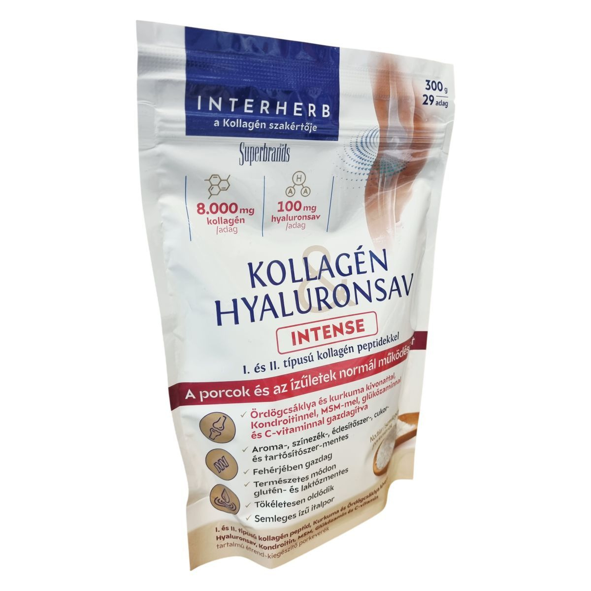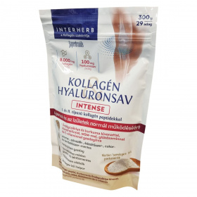Az izületek rugalmassága és teherbíró képessége a kor előrehaladtával csökkenhet, ami befolyásolhatja a mindennapi életvitelt, különösen fokozott fizikai aktivitás vagy sport esetén. Ezért szervezetünknek és izületeinknek több építőelemre lehet szüksége. Az Interherb Kollagén Hyaluronsav Intense porkeverék jól oldódó, semleges ízű és nagydózisban tartalmazza az izületek természetes alkotóelemeit. A kurkuma és az ördögcsáklya standardizált kivonatai hozzájárulhatnak az izületek mozgékonyságának és rugalmasságának megőrzéséhez. A benne található I. típusú kollagén a bőr, csontok, inak és szalagok nélkülözhetetlen vázanyaga, míg a II. típusú kollagén az izületek és porcok építőköve. A hyaluronsav nagy vízmegkötő képessége révén elsősorban az izületi folyadék megtartásában játszhat szerepet. A C-vitamin hozzájárulhat a normál kollagénképződéshez, ezáltal a porcok és csontok megfelelő állapotának fenntartásához, míg a kondroitin, MSM és glükózamin a porcszövetek és izületek természetes alkotóelemei lehetnek. A termék cukor-, édesítőszer-, aroma-, színezék- és tartósítószer-mentes, természetes módon glutén- és laktózmentes, így sokféle étrendi igényhez illeszthető. Fogyasztása 2-3 hónapos kúrában javasolt, ezt követően 2 hét szünet ajánlott.