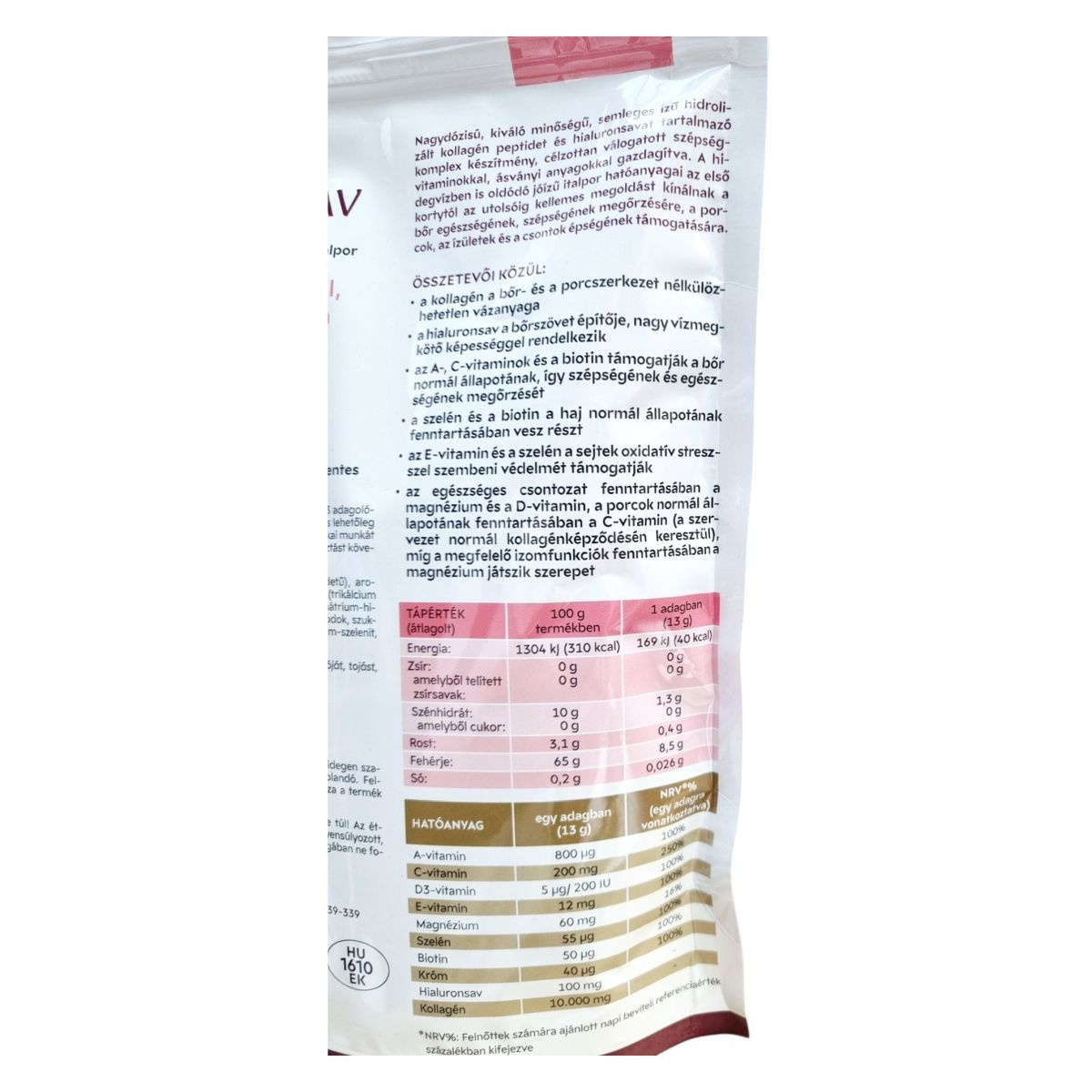 A termék nagy dózisú kollagént és hyaluronsavat tartalmaz, amelyek hozzájárulhatnak a bőr, a porcok és az ízületek egészségéhez. Vitaminokkal és ásványi anyagokkal gazdagítva, laktóz- és tartósítószer-mentes.