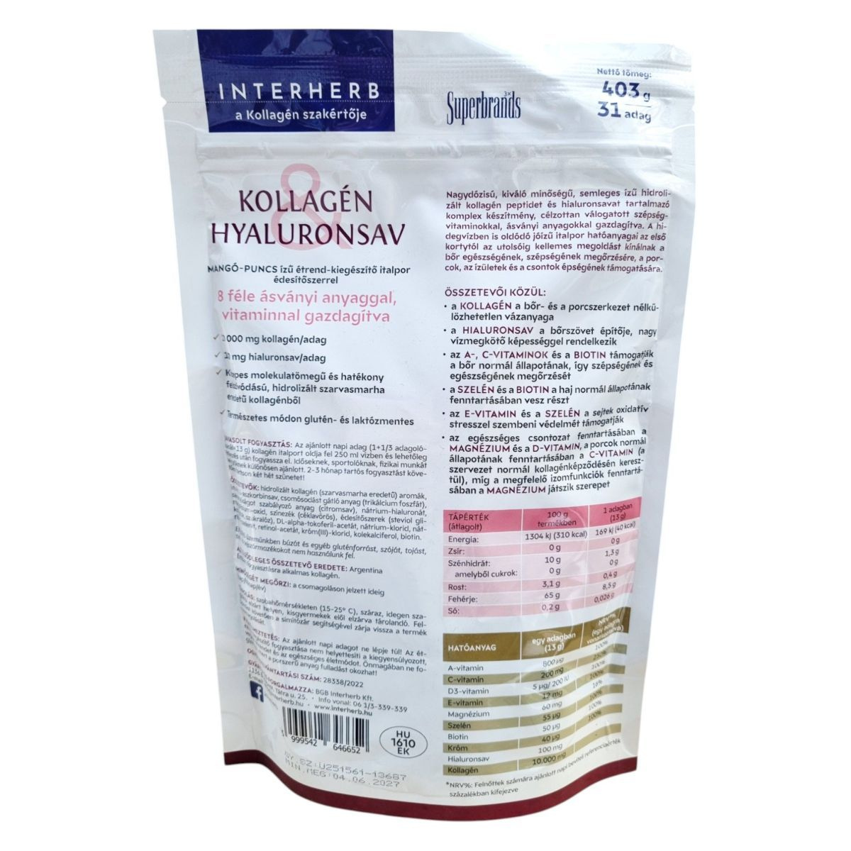 Az INTERHERB KOLLAGÉN & HYALURONSAV mangó-puncs ízű étrend-kiegészítő italpor célzottan válogatott szépségvitaminokkal és ásványi anyagokkal gazdagítva készült. A termék 10 000 mg hidrolizált szarvasmarha eredetű kollagént és 100 mg hyaluronsavat tartalmaz adagonként, amelyek hozzájárulhatnak a bőr, a csontok, porcok és ízületek egészségének támogatásához. A termék cukor- és tartósítószer-mentes, valamint természetes módon glutén- és laktózmentes. A vitaminok, mint az A-, C-, D-, E-vitaminok, valamint a biotin, szelén és króm, hozzájárulhatnak a bőr normál állapotának fenntartásához, a sejtek oxidatív stresszel szembeni védelméhez és az egészséges csontozat fenntartásához. Az italpor könnyen oldódik hideg vízben is, és kellemes ízvilágot kínál.
