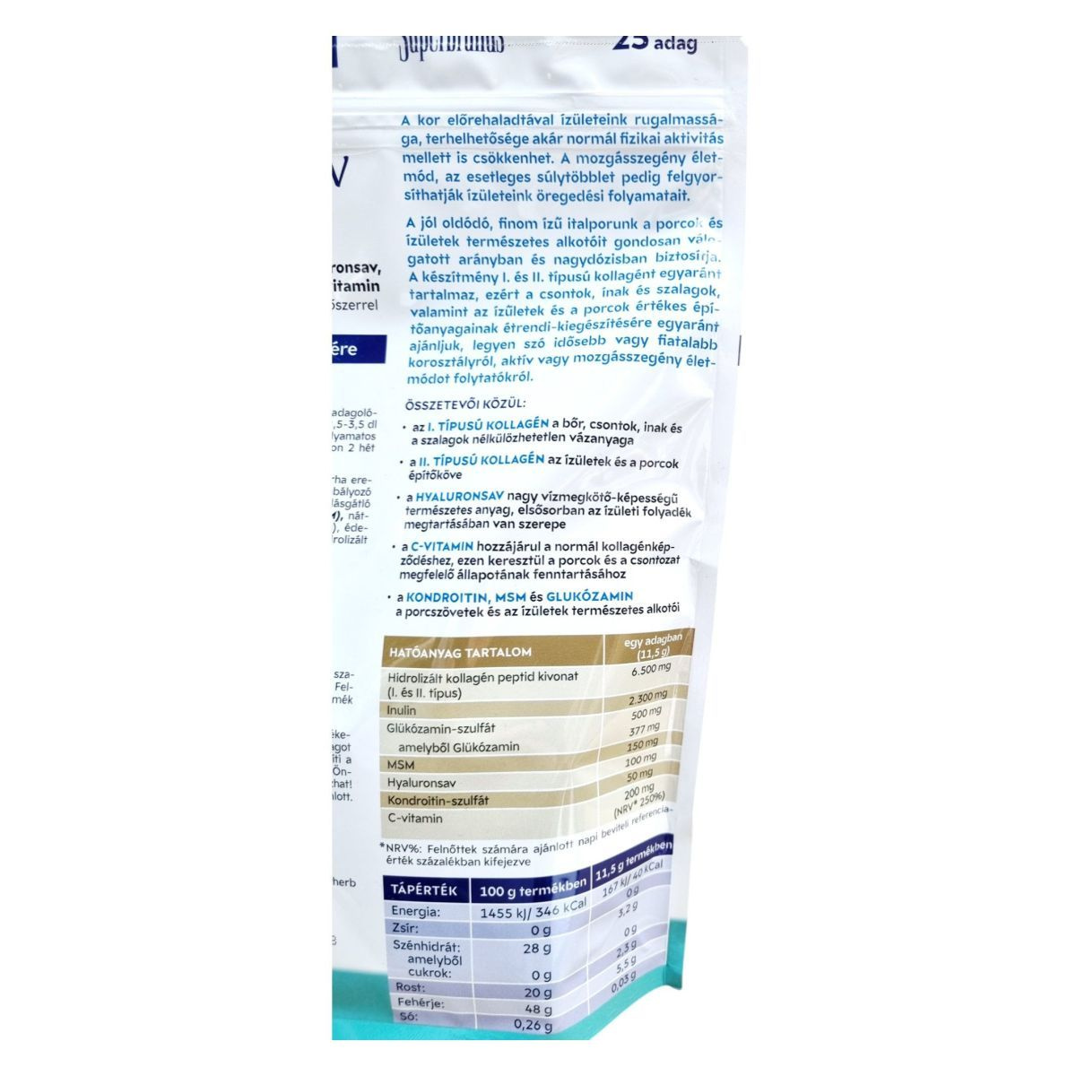 Hidrolizált kollagén kivonat (szarvasmarha eredetű), inulin, glükózamin-szulfát, savanyúságot szabályozó anyag (citromsav), aromák, L-aszkorbinsav, csomósodásgátló anyag (trikalcium foszfát), metil-szulfonil-metán (MSM), nátrium-hialuronát, kondroitin-szulfát, színezék (céklarózsa), édesítőszer (steviol glikozidok, szukralóz), étkezési só, hidrolizált kollagén kivonat (csirke eredetű).