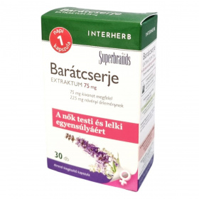 Az Interherb Barátcserje Extraktum 75 mg egy standardizált, 3x koncentrációjú növényi kivonatot tartalmazó étrend-kiegészítő kapszula, amely kifejezetten a nők testi és lelki egyensúlyának támogatására készült. A barátcserjét régóta alkalmazzák a hormonális változások időszakaiban, például a menstruációs ciklus és a menopauza alatt, mivel hozzájárulhat a kellemetlen tünetek enyhítéséhez. A készítmény a nők hormonális, testi és mentális harmóniájának fenntartásában játszhat szerepet, valamint támogathatja a szervezet oxidatív stresszel szembeni védekezését. Egy kapszula 75 mg barátcserje kivonatot tartalmaz, amely 225 mg szárított termésőrleménynek felel meg. A napi 1 kapszula szedése egyszerű és praktikus, étkezés közben ajánlott. A termék hazai fejlesztésű, bevizsgált alapanyagból készül, és a megbízható minőséget koncentrált extraktum formájában garantálja.