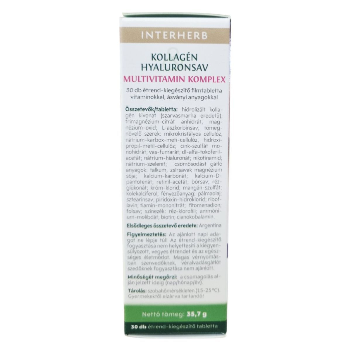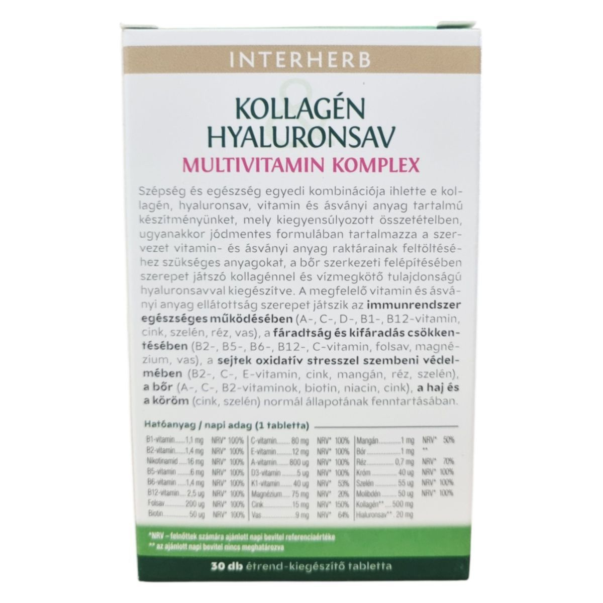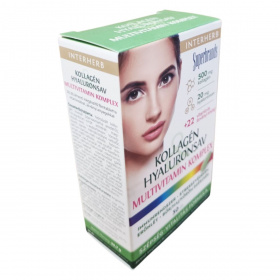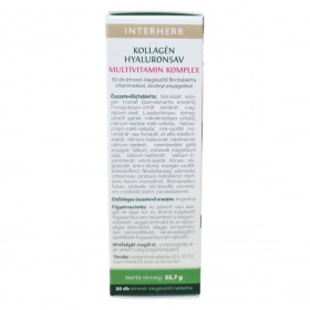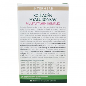 Az INTERHERB KOLLAGÉN & HYALURONSAV MULTIVITAMIN KOMPLEX egy olyan étrend-kiegészítő, amely kollagént, hyaluronsavat, vitaminokat és ásványi anyagokat tartalmazhat. A termék célja, hogy támogassa az immunrendszer működését, a stresszvédelemben, az erőnlét fenntartásában, valamint a bőr, haj és köröm egészségének megőrzésében. A készítmény szabadalmaztatott technológiával gyártott, nagy tisztaságú kollagén és hyaluronsav kivonatot tartalmazhat, amely hozzájárulhat a bőr szerkezeti felépítéséhez és vízmegkötő tulajdonságai révén a hidratáltság fenntartásához. A termék jódomentes formulával rendelkezik, és a vitaminok és ásványi anyagok kiegyensúlyozott összetételben találhatók meg benne.