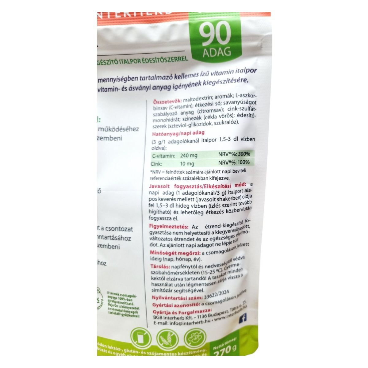 Az INTERHERB C-vitamin és Cink italpor egy meggy-vanília ízű étrend-kiegészítő, amelyet a szervezet megnövekedett vitamin- és ásványi anyag igényének kiegészítésére fejlesztettek ki. A termék jelentős mennyiségű C-vitamint és cinket tartalmaz, amelyek hozzájárulhatnak az immunrendszer normál működéséhez, a sejtek oxidatív stresszel szembeni védelméhez, valamint a fáradtság és kifáradás csökkentéséhez. A cink ezen felül támogathatja a normál szellemi működést, a bőr, haj és köröm egészséges állapotának fenntartását, valamint a normál látás fenntartását is. A termék 270 g-os kiszerelésben kapható, és 90 adag elkészítésére elegendő. A csomagolás 100%-ban újrahasznosítható, így környezetbarát választás lehet.