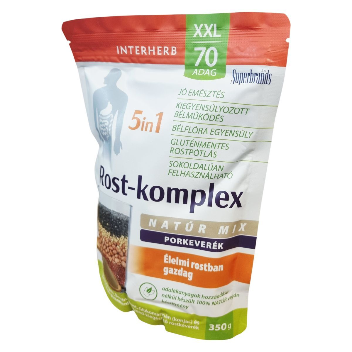 Az Interherb Rost-Komplex 5in1 rostkeverék az inulin, akácia gumi, bambuszrost, glükomannán (konjac) és zabrost kombinációján alapuló természetes, adalékanyagoktól mentes étrend-kiegészítő. A termék hozzájárulhat a normál bélműködés fenntartásához, a megfelelő székletmennyiség biztosításához és a bélflóra egyensúlyához, különösen mozgásszegény életmód esetén vagy olyan élethelyzetekben, amikor a bélműködés lassulhat. Az inulin komplex rostként segítheti a vastagbél hasznos baktériumainak növekedését. A rostok vízmegkötő, lágyító és bélmozgást fokozó hatásuk miatt támogathatják az emésztési folyamatokat. A hazai átlagos rostbevitel elmaradhat az ajánlott napi 30 grammtól, ezért a termék fokozatos, változatos rostfogyasztásban segítheti a kiegyensúlyozott táplálkozást. Natúr, ízesítetlen porkeverék, amely könnyen adagolható és sokféle ételbe vagy italba keverhető, miközben 100%-ban vegán és gluténmentes. A csomagolás 100%-ban újrahasznosítható, ezzel támogatva a környezetvédelmet.