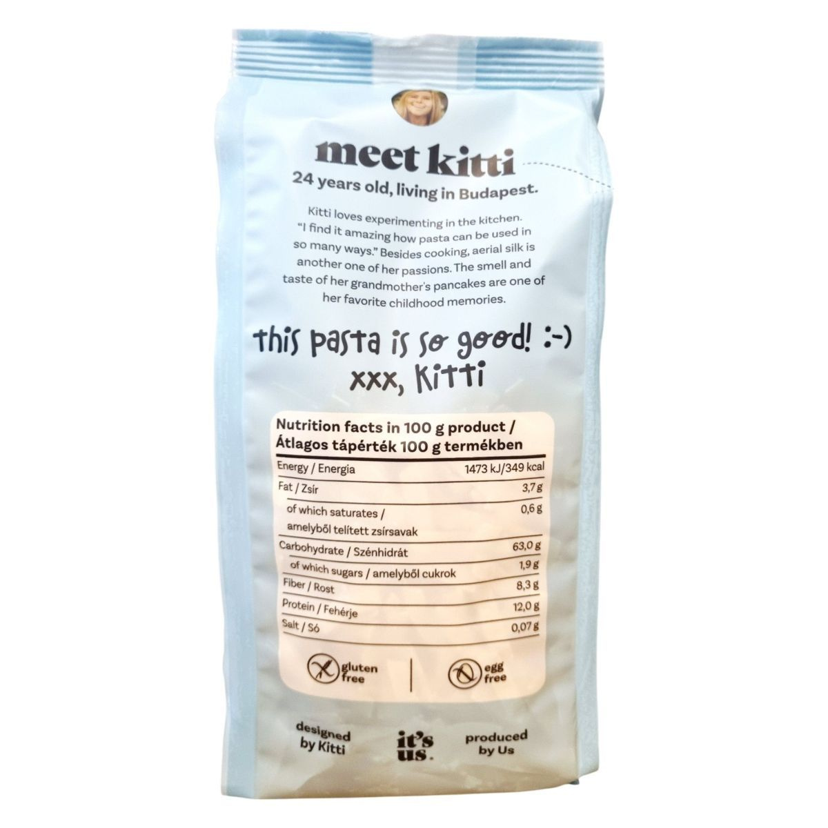 A Kitti’s Chickpea Pasta szélesmetélt változata a Mimen termékcsalád része, amely gluténmentes, tojásmentes és vegán összetevőkkel készül. A csicseriborsó természetes fehérjéinek és rostjainak köszönhetően tápanyagdús és könnyen emészthető. Rövid főzési idejével praktikus választás a mindennapi étkezésekhez, egészséges alternatívát kínálva a hagyományos tészták helyett.